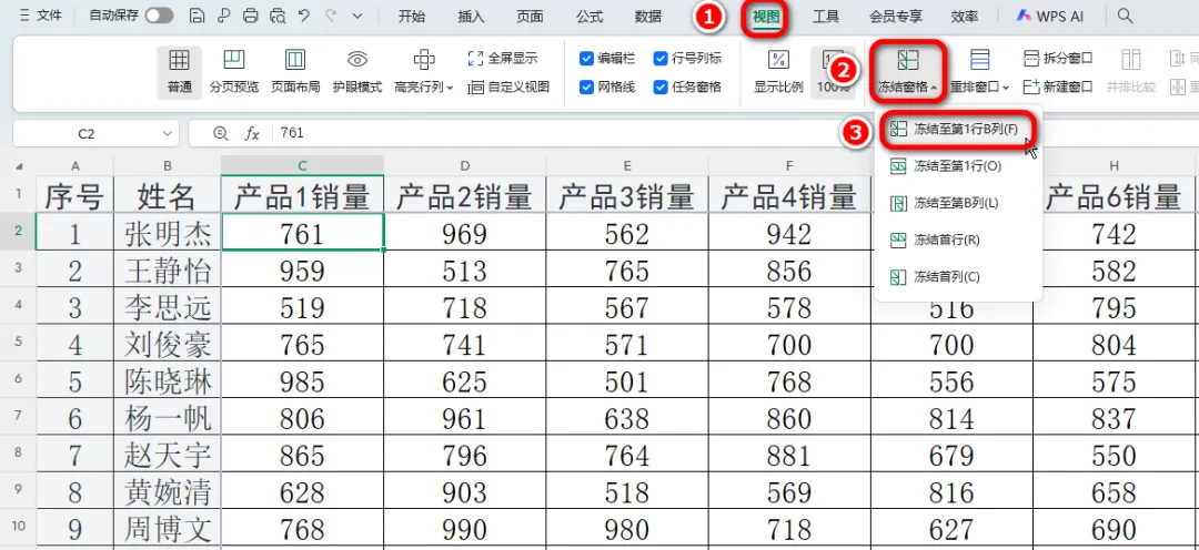 2. 点击「视图」→「冻结窗格」→「冻结至第1行B列」。