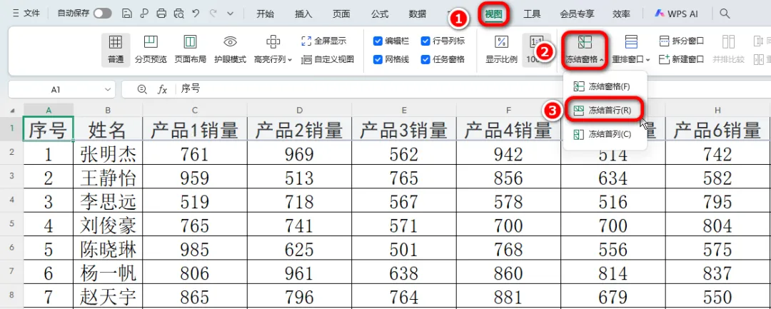 方式一:冻结首行:保持表格顶部的标题行可见。