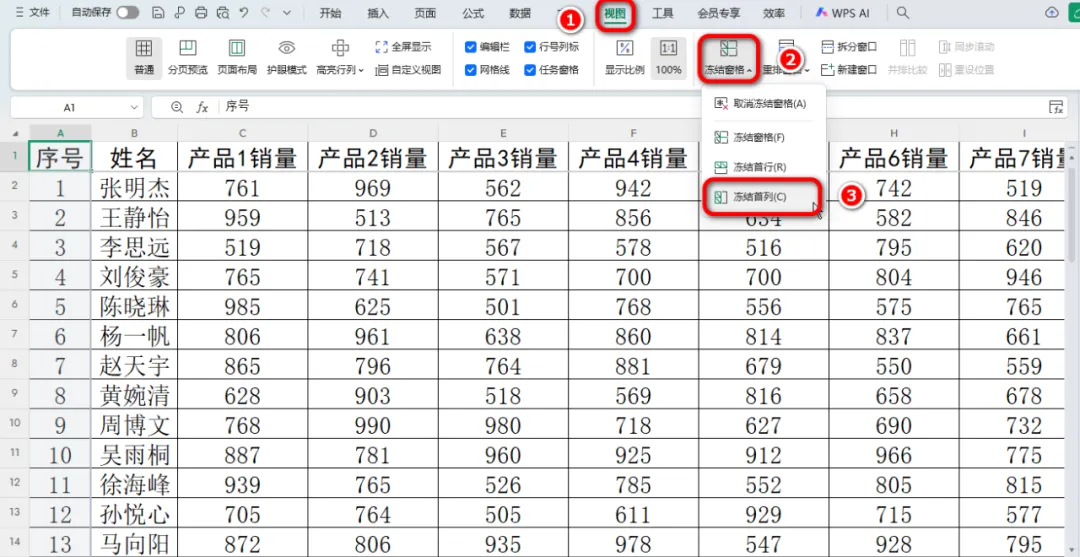方式二:冻结首列:保持最左侧的列可见。