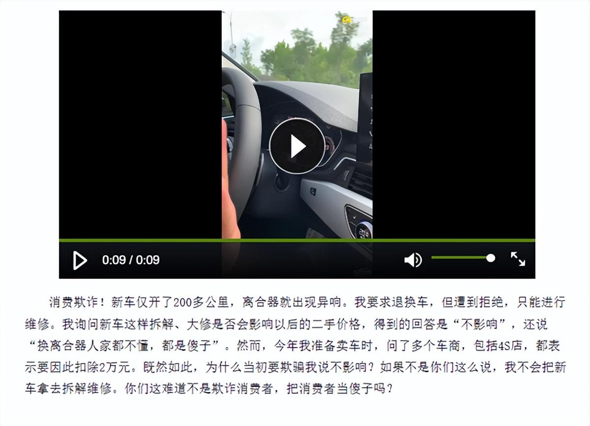 车主表示,奥迪A4L车辆变速箱异响问题不是个例,已经是批量问题,质疑厂家为什么不召回升级、维修。