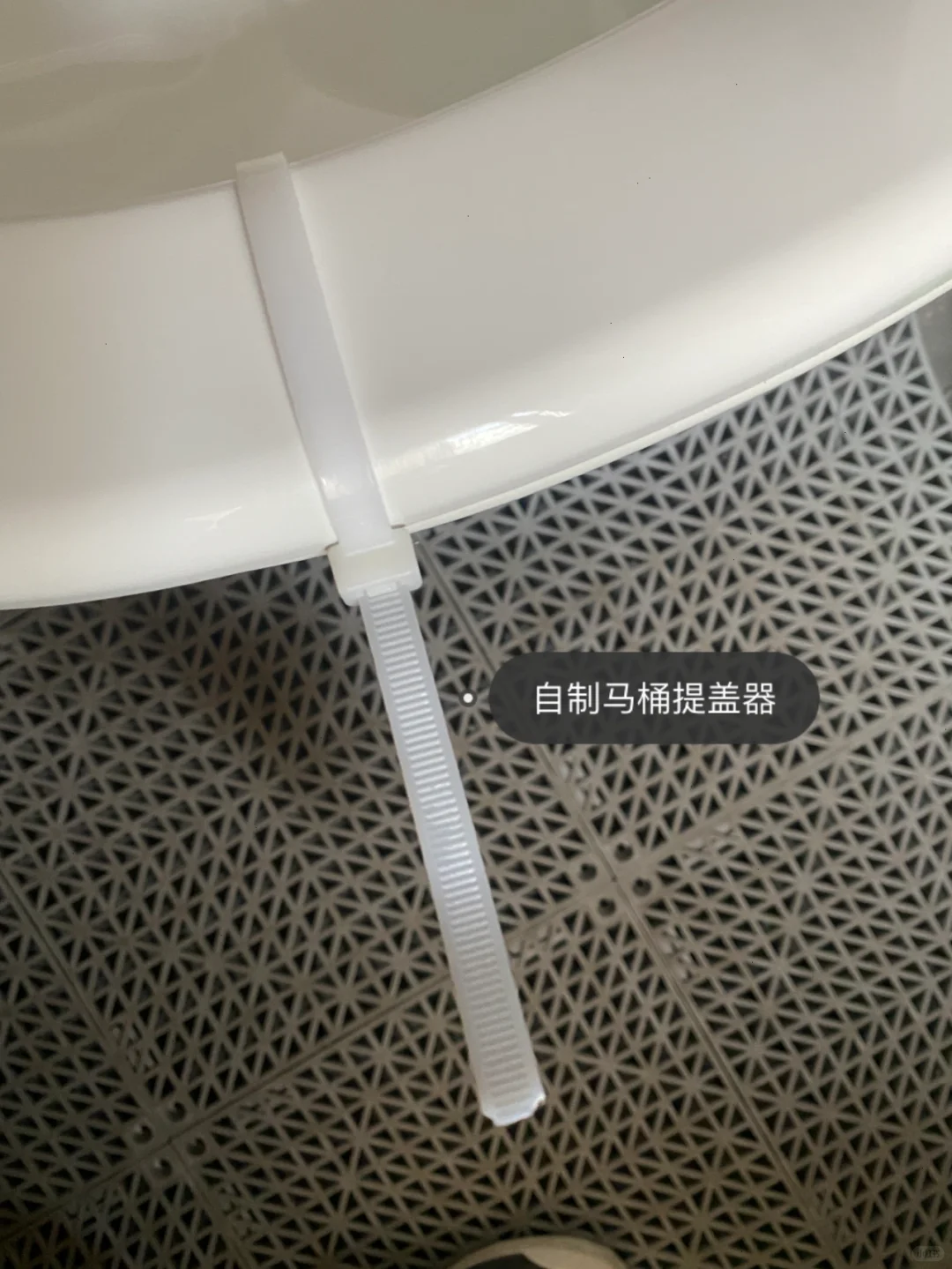 其实很简单,准备一个尼龙扎带,然后把它固定在马桶圈上面,来当做马桶的手提,不用手直接接触更加卫生。