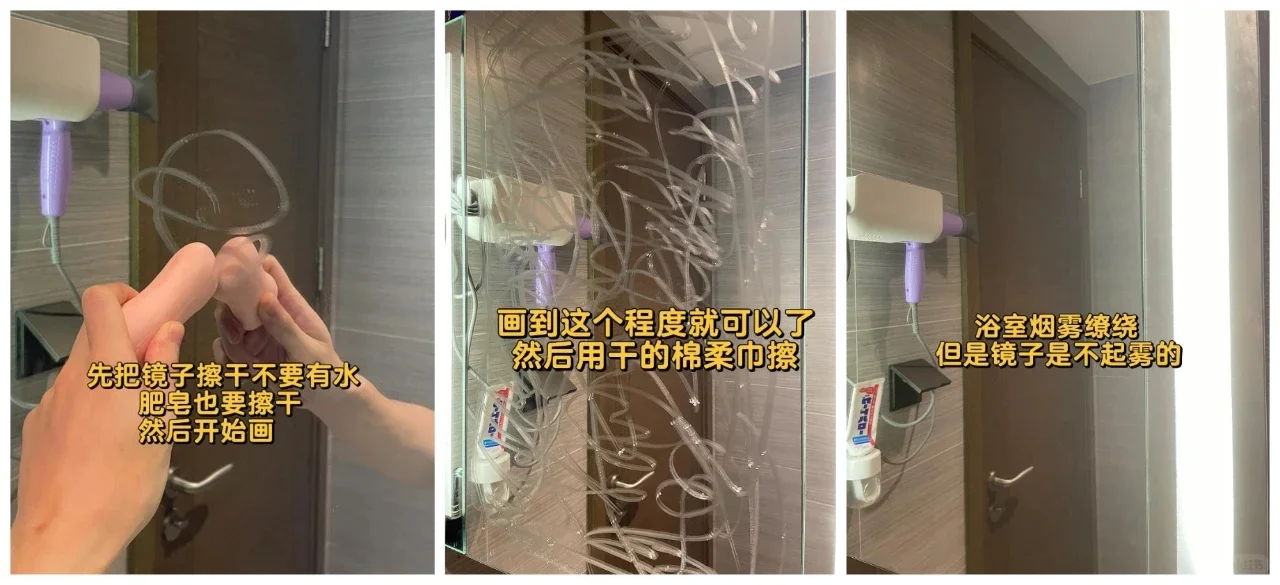 我们把镜子擦干净,然后找一块干香皂,把它直接涂抹在镜面上画圈,反复涂抹,然后再用柔纸巾将肥皂擦干净,这样肥皂会在镜子表面形成一层保护膜,能够防止镜子起雾。