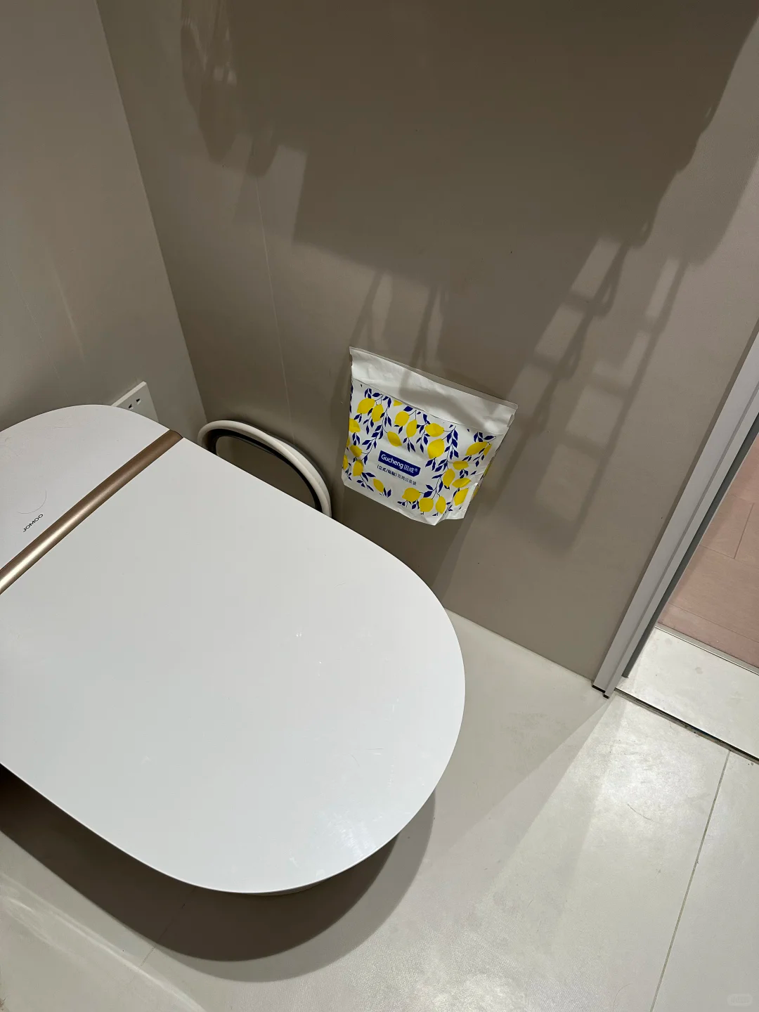 其实卫生间可以不放垃圾桶,把垃圾袋直接粘在墙上,这样每天一清理,节省地面空间更加干净卫生。