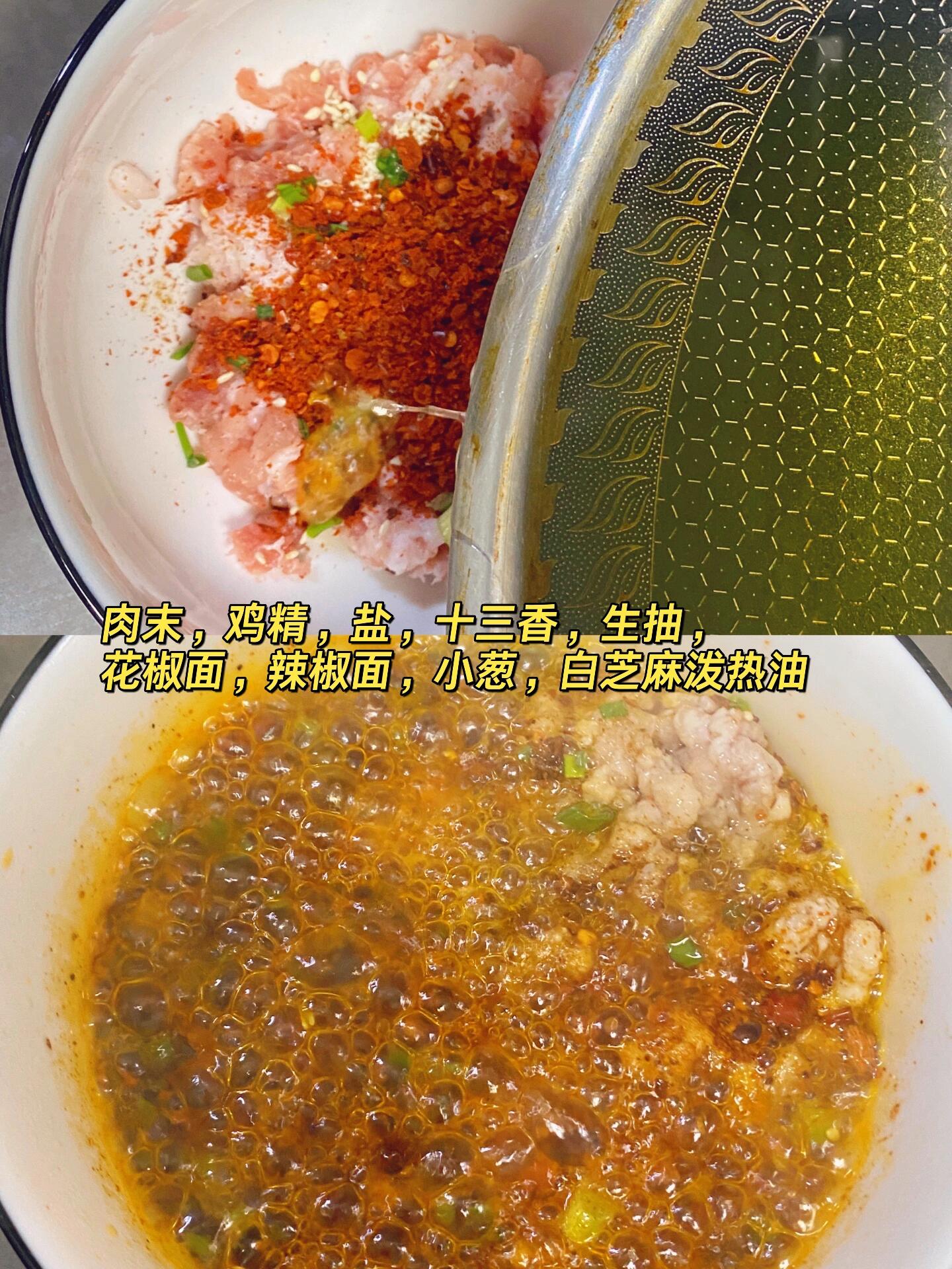 把肉沫放进碗里,加入鸡精、盐、十三香、生抽,搅拌均匀。接着,撒上花椒面和辣椒面,再放上切好的小葱和白芝麻。这时候,烧一些热油,把热油“滋啦”一声泼在调料上,瞬间,香味就扑鼻而来。用筷子搅拌均匀,香辣的肉馅就调好啦!