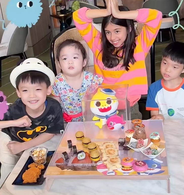 梁咏琪一家到达水上乐园后,首先去酒店放下行李。他们定的是经典儿歌“Baby Shark”主题房,只见房间摆满了卡通海洋动物装饰以及精致的甜品,Sofia看到后兴奋不已,脸上挂满笑容。