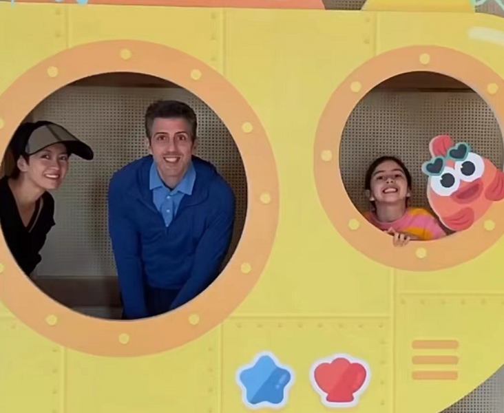 一家人还在潜艇背景板上拍照留念,他们均对着镜头笑出一口大白牙,画面温馨有爱。仔细观察,已经8岁的Sofia,长得很像老爸,父女同框如复制粘贴。