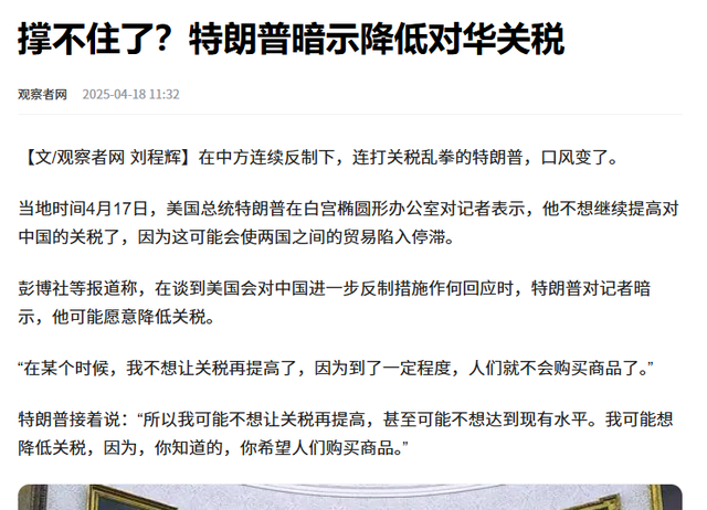 2025年4月17日,特朗普罕见在白宫放软话风,声称“不想让关税再提高”,并暗示可能会降低对华关税。