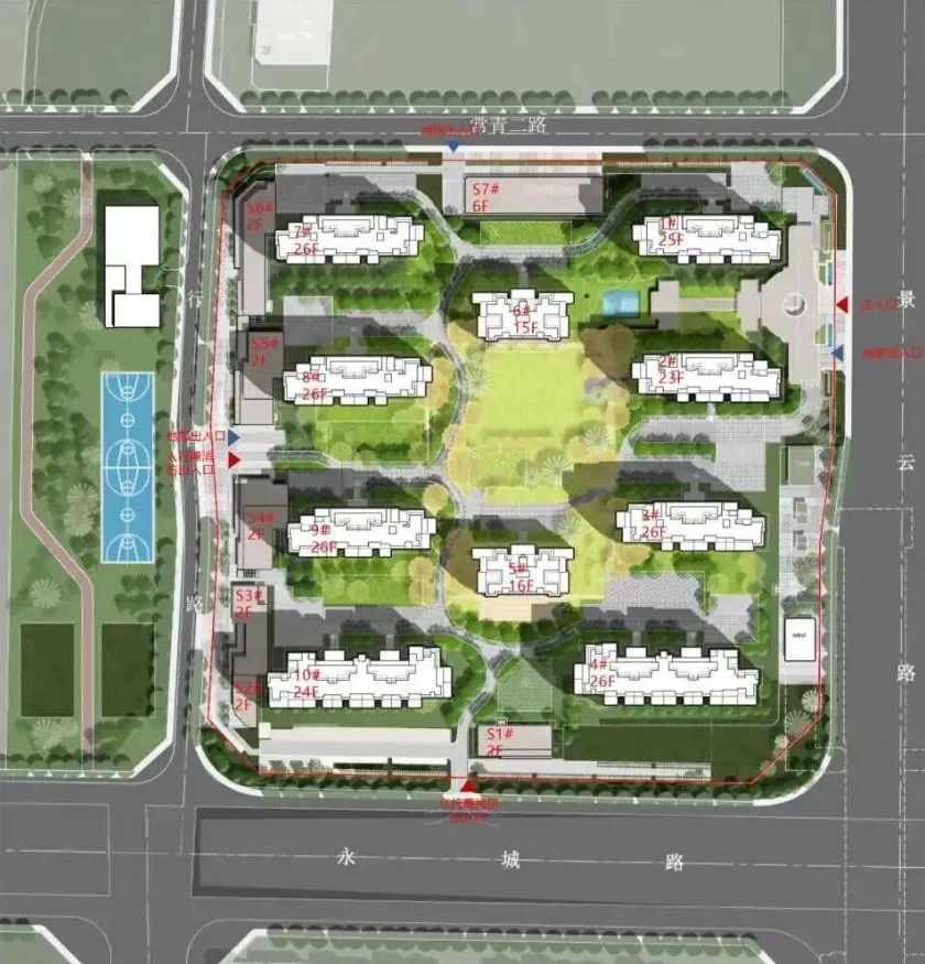 项目占地约77亩,容积率2.3,项目规划10栋楼,含8栋23-26F的高层、2栋15-16F的小高层。