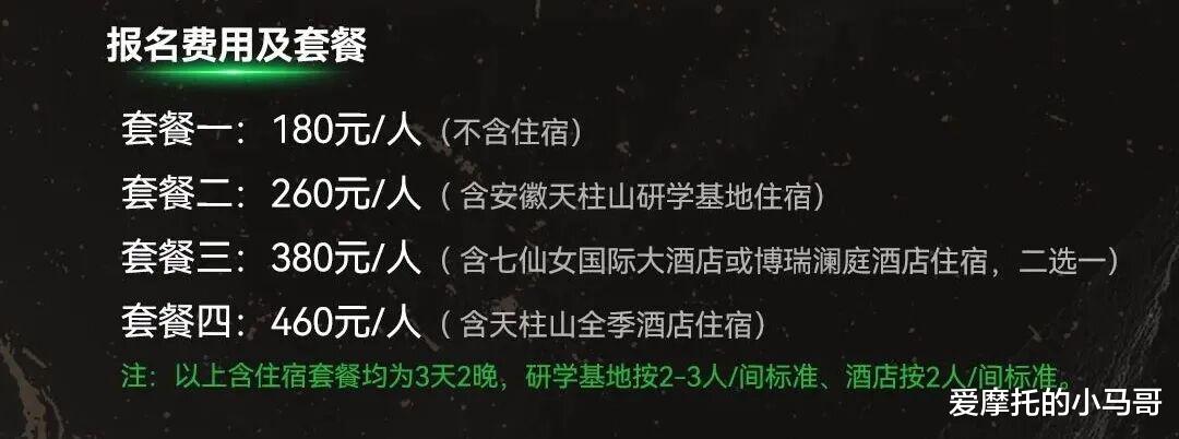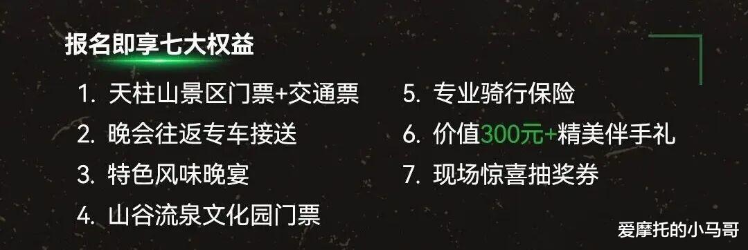 为啥说报名不贵呢?因为这次活动只要报名成功,就能获得七大权益:包括天柱山景区 + 山谷流泉文化园门票 + 往返交通票 + 晚会往返专车接送以及特色风味晚宴。除此之外还有专业骑行保险、现场惊喜抽奖和十周年专属伴手礼。