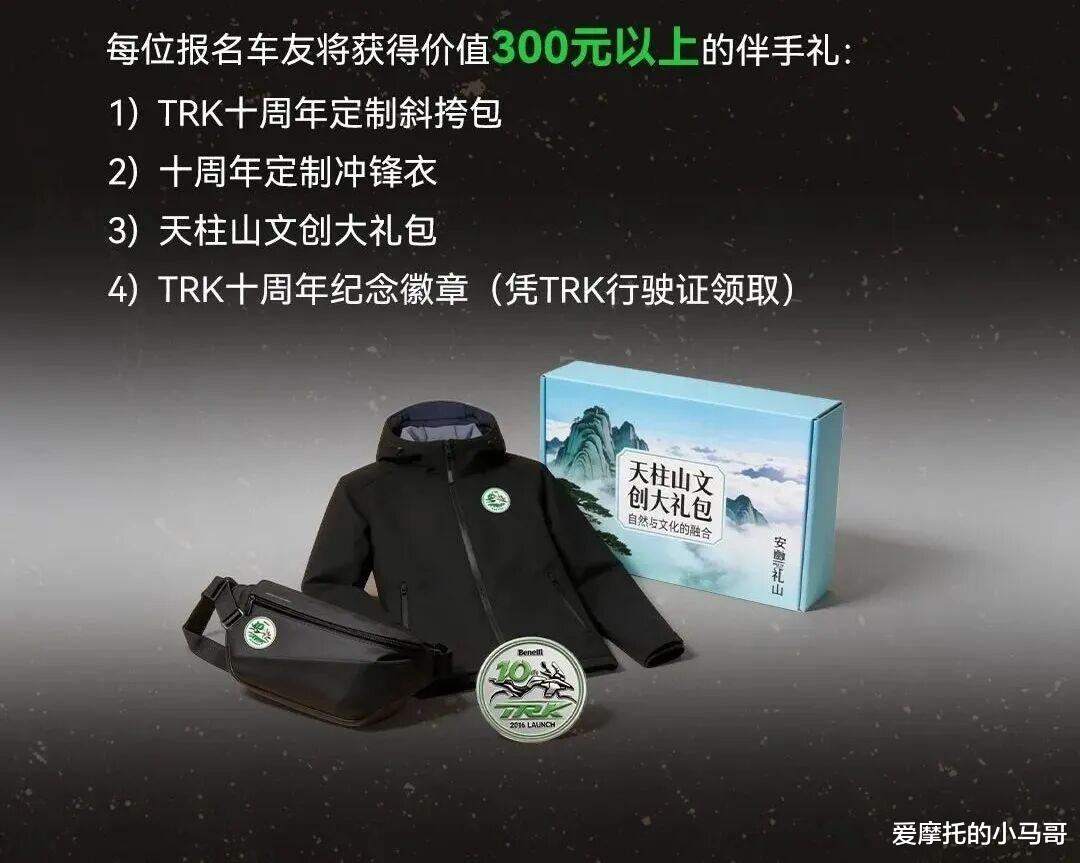 当然,主办方也为每一位赴约的车友,准备了独属于十周年的纪念礼。每位成功报名的车友,都能领到价值300+的专属伴手礼:TRK十周年定制斜挎包、定制冲锋衣、天柱山文创大礼包一应俱全,凭TRK行驶证还能额外领取十周年专属纪念徽章,为参加活动的车友留下专属的时光印记。