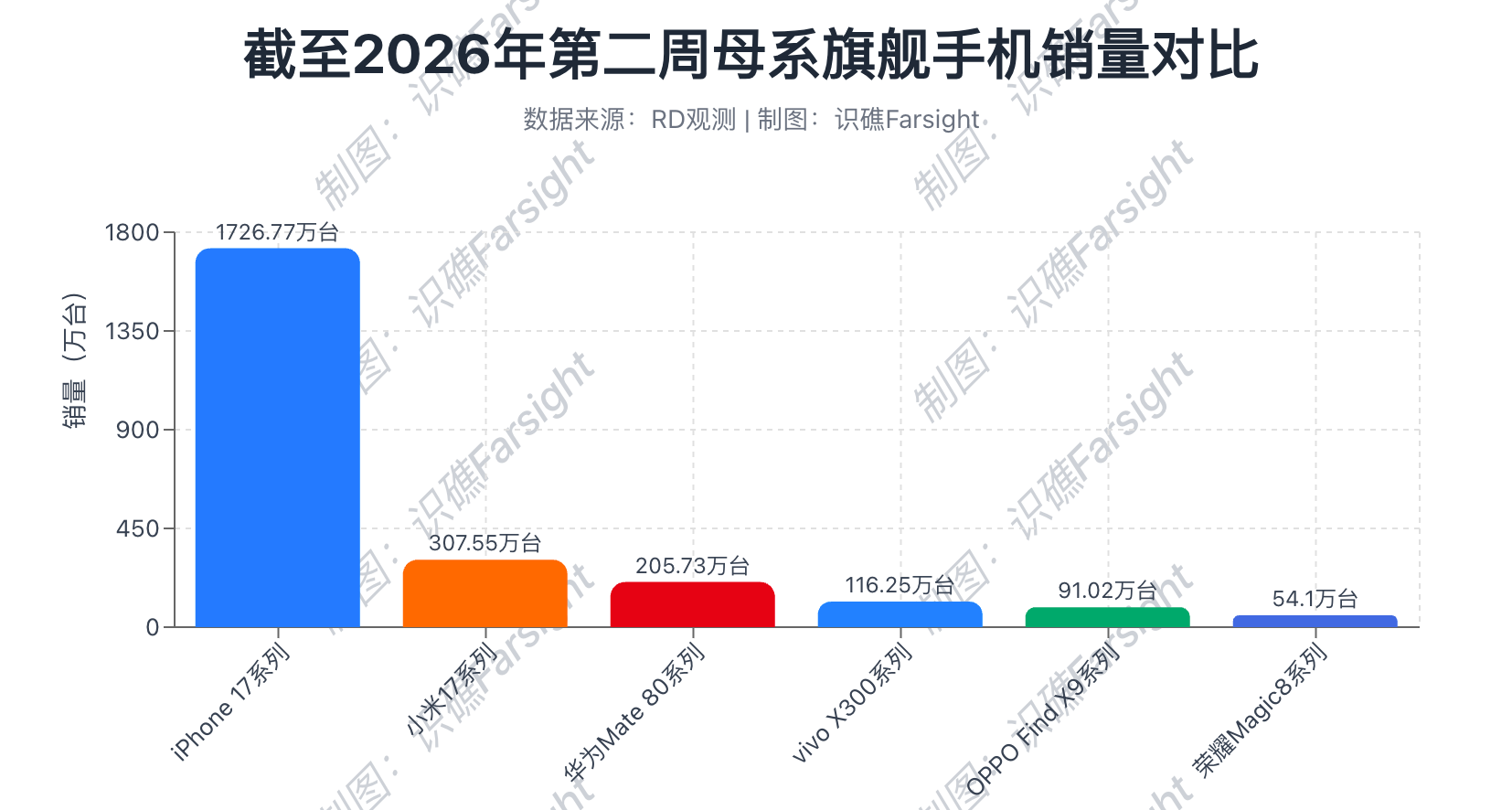 细节方面,截至2026年第二周,iPhone 17系列、小米17系列、华为Mate 80系列、vivo X300系列、OPPO Find X9系列以及荣耀Magic8系列的销量分别约为1726.77万台、307.55万台、205.73万台、116.25万台、91.02万台以及54.1万台。