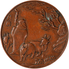 该纪念章正面以浅浮雕刻画“苏武牧羊”场景,苏武持节而立,身旁牛羊成伴,背景点缀飞鸟、枯树,构图简洁却富有叙事性,生动再现了汉代苏武坚守气节的经典形象。1933年,中国正处于民族危机深重之际(九一八事变后东北沦陷,华北局势紧张)。第五届全国运动大会的举办,旨在通过体育强健国民体魄、凝聚民族精神。纪念章选用“苏武牧羊”题材,既弘扬了民族气节,也呼应了体育竞技中“坚持抗战、永不言弃”的精神。