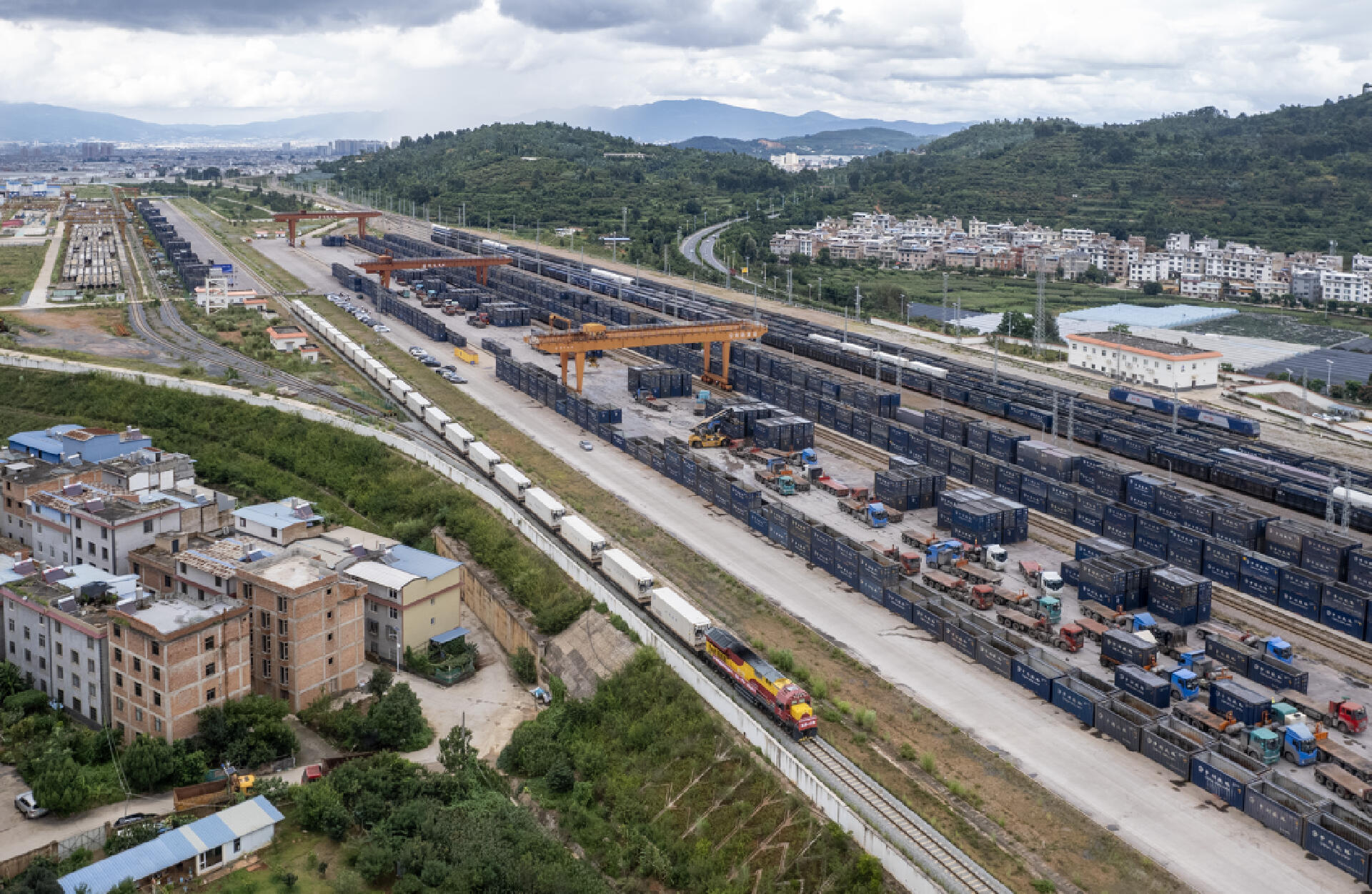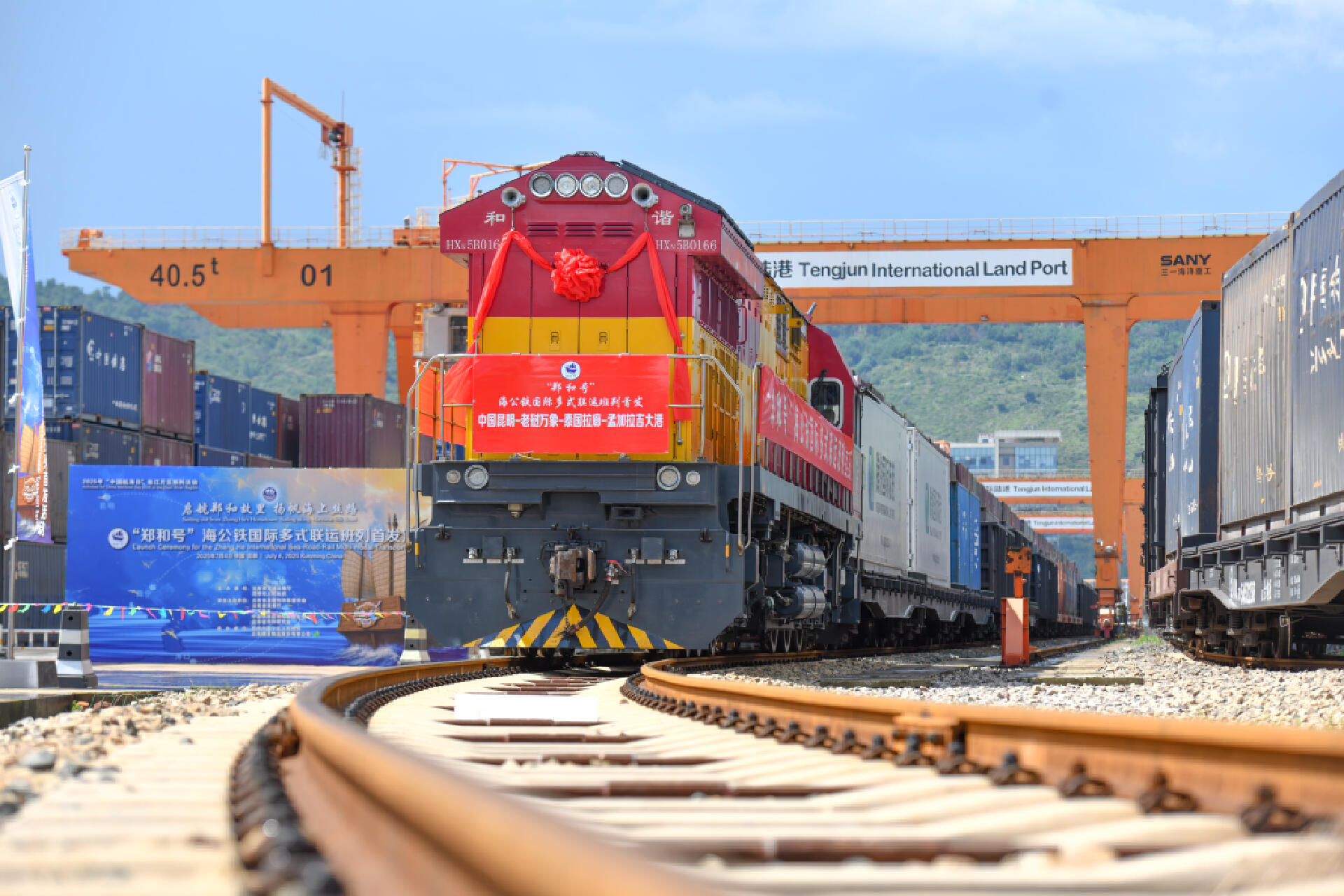 “郑和号”海公铁国际多式联运班列首发列车在昆明市腾俊国际陆港公铁联运中心等候发车(2025年7月4日摄)。 新华社记者 彭奕凯 摄