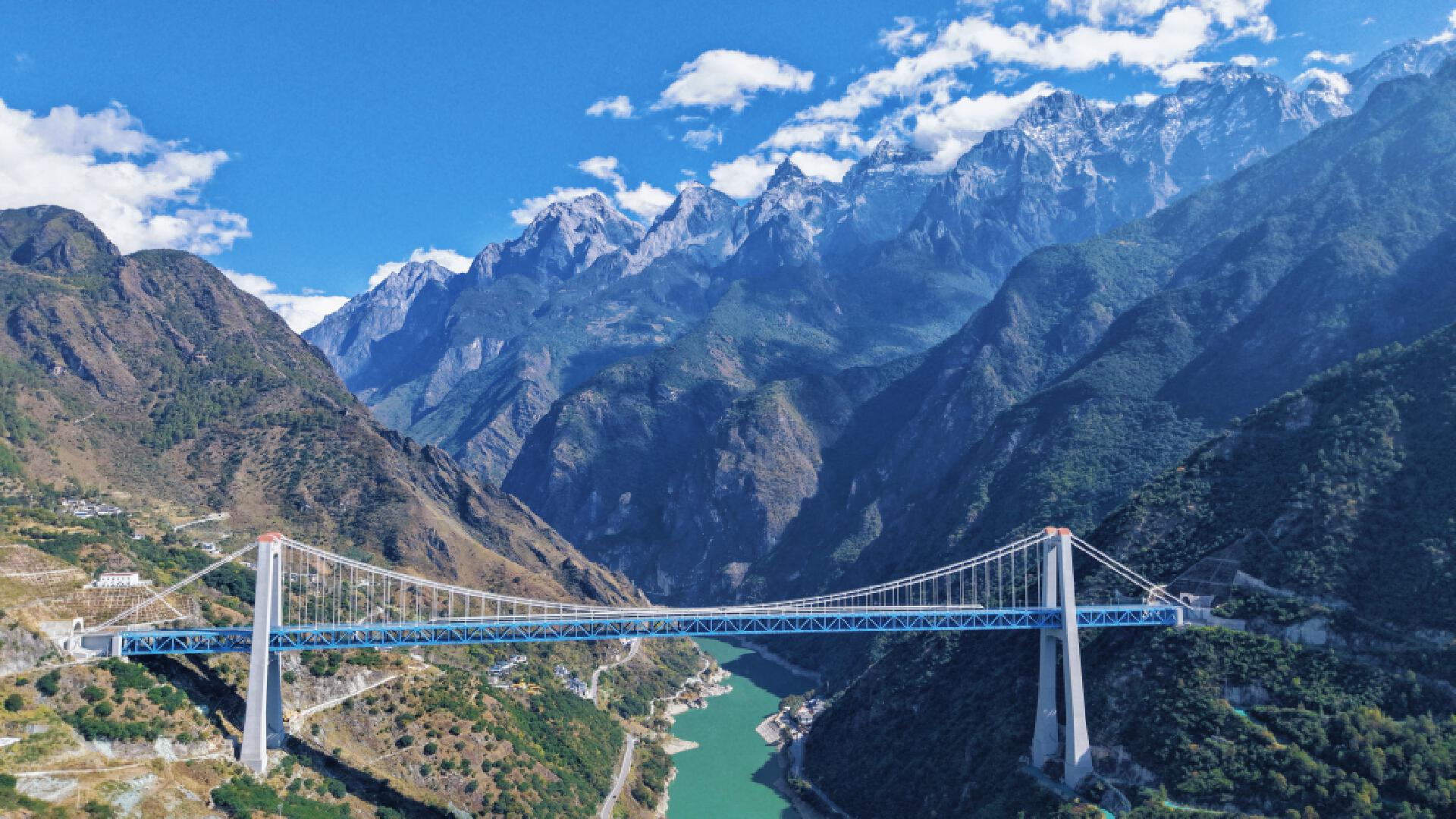 这是全长882.5米的虎跳峡金沙江铁路大桥。大桥起于玉龙雪山隧道出口,止于哈巴雪山隧道进口,是丽香铁路的重点控制性工程(2025年11月21日摄,无人机照片)。新华社发(杨紫轩摄)