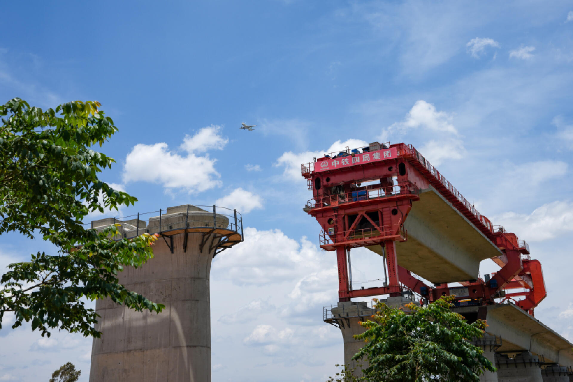 中铁四局渝昆高铁昆明枢纽段八家村跨沪昆铁路特大桥架梁施工现场(2025年5月21日摄)。 新华社记者 陈欣波 摄