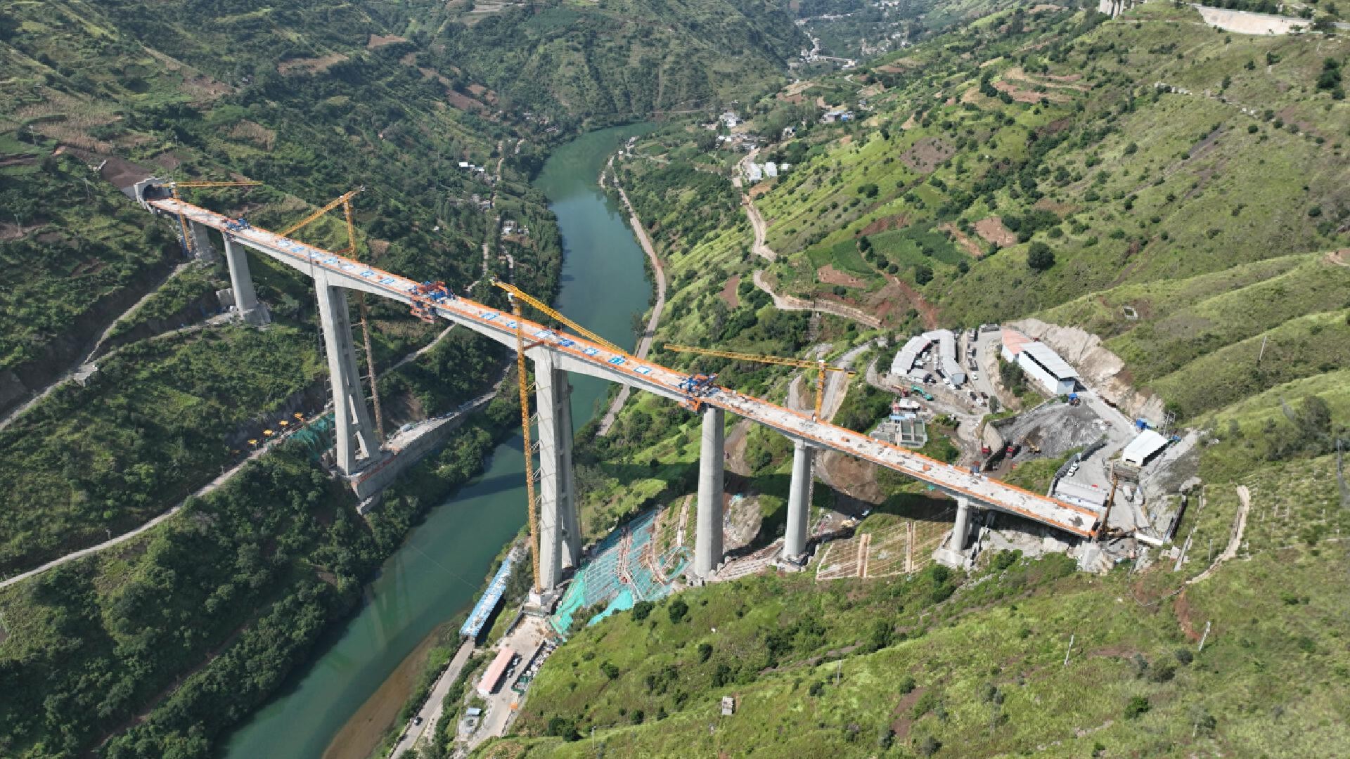 在云南省昭通市鲁甸县江底镇拍摄的渝昆高铁江底牛栏江特大桥合龙现场(2025年9月7日摄,无人机照片)。新华社发(张广玉摄)