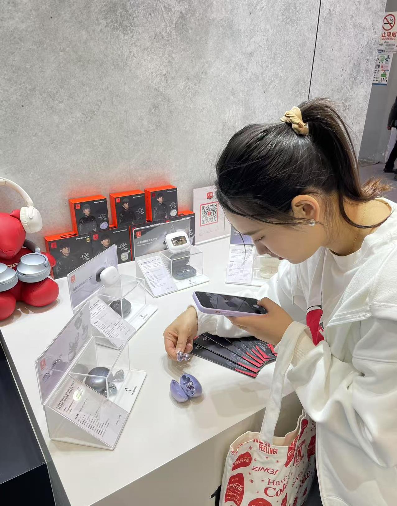 在展会现场,一位年轻女士好奇地走入1MORE万魔的展区,她被耳机和智能眼镜吸引住,但在选择的时候犹豫不决。