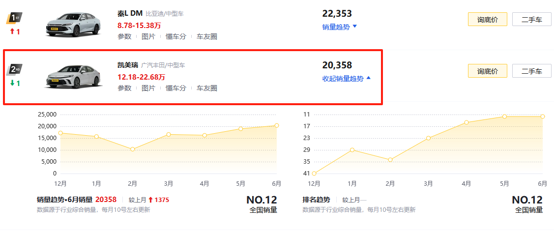 提起丰田凯美瑞,相信经常了解车的人都有话说,作为中型车细分领域中的热卖车型,它在燃油车时代和电动化时代初期也确实成绩傲人。不过随着秦L DM和海豹06DM的上市,让合资车的优势也不再明显,所以凯美瑞的销量也受到了很大的冲击。为了挽回这一局面,凯美瑞也被迫加入降价保份额阵营,此前17.18万元起售的车型,如今裸车价为12.18万元,靠着价格优势,又重新吸引了消费者。