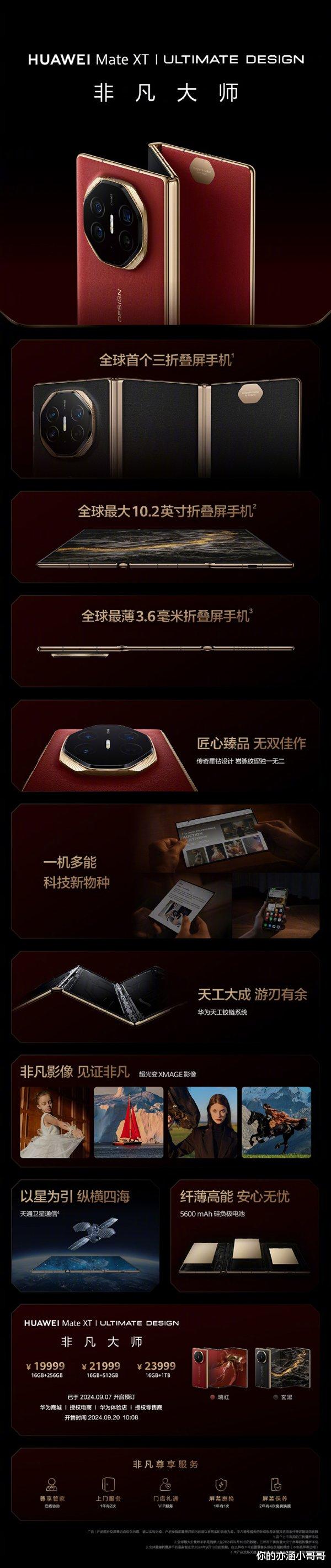 其售价为:16GB + 256GB 版本 19999 元,16GB + 512GB 版本 21999 元,16GB + 1TB 版本 23999 元。二、强大功能:引领未来的智能体验1. 震撼视觉享受:10.2 英寸的超大屏幕,分辨率达到了 2232x3184,无论是观影、追剧还是进行办公,都能提供非凡的视觉享受,让用户仿佛置身于一个移动的私人影院或高效的办公空间。2. 卓越影像系统:新机搭载后置三摄影像模组,其中主摄采用 5000 万像素 CMOS,拥有 1/1.56"大底,并且支持 f/1.4 - f/4.0 十档可变光圈,可以根据场景智能调控光圈大小,让光影处理更细腻,这也是华为首款搭载十档可变光圈的折叠屏产品。此外,还配备了一枚 1200 万像素的超广角镜头和一枚 1200 万像素的 5.5 倍潜望长焦镜头,能够捕捉到更远处的风景。软件方面,同样搭载华为 XMAGE 影像引擎,支持 AIGC 图片编辑,包括 AIGC 扩图、AIGC 消除等,也支持 AI 云画质增强功能,让用户随时随地都能拍摄出专业级的照片。3. 强劲性能配置:华为 Mate XT 非凡大师搭载了全球最薄硅负极大容量电池,厚度仅 1.9mm,容量达到 5600mAh,支持 66W 有线+50W 无线快充,为手机的续航提供了有力保障。同时,还支持灵犀通信、天通卫星通话等功能,确保用户在各种环境下都能保持畅通的连接。4. 创新交互方式:三折叠屏幕的创新设计带来了“一机多能”的多形态体验,为消费者提供单屏态、双屏态、三屏态多种形态,适应不同场景的需求。完全折叠时可以开启单屏态,屏幕尺寸与直屏手机相似,尺寸为 6.4 英寸,分辨率为 2232x1008,用户可以单手操控,携带方便、操控简单;双屏态则带来了 7.9 英寸屏幕,分辨率更是达到了 2232x3184,与一般双屏折叠机相似,可以实现一边聊天、一边刷微博等体验;开启三屏态时屏幕尺寸为 10.2 英寸,提供更沉浸的大屏体验,带来非凡的视觉享受,不仅观影、追剧更具沉浸感,办公时还能够提供更高效、更便捷的大屏优势,满足商务人群的移动办公需求。三、适用人群:满足多元需求的科技杰作华为 Mate XT 非凡大师凭借其独特的设计与强大的功能,适用于多种人群:1. 商务精英:对于经常需要移动办公的商务人士来说,这款手机的三屏态提供了更大的办公空间,方便处理邮件、编辑文档、查看资料等,搭配折叠触控键盘,进一步提高了办公效率。同时,其高端的外观设计也符合商务场合的气质需求。2. 科技爱好者:那些对科技充满热情,追求最新、最前沿技术的科技爱好者们,华为三折叠屏幕手机无疑是他们的理想之选。其创新的折叠设计、先进的功能以及华为在技术研发上的突破,都能满足他们对科技产品的探索欲望。3. 时尚达人:时尚不仅仅体现在服装和配饰上,手机也成为了时尚的重要元素。华为 Mate XT 非凡大师的独特外观和精致工艺,使其成为了时尚界的新宠。无论是在社交场合还是日常生活中,拿着这款手机都能彰显出独特的个性与品味。4. 摄影爱好者:强大的影像系统,包括高像素主摄、超广角镜头以及潜望长焦镜头,再加上丰富的拍摄模式和影像功能,对于热爱摄影的人来说,无论是拍摄风景、人物还是进行创意摄影,都能提供出色的拍摄体验和创作空间。四、未来展望:折叠屏手机的新里程碑华为 Mate XT 非凡大师的发布,不仅是华为在折叠屏技术上的又一次重大突破,更是为整个手机行业树立了新的标杆。它的出现,将进一步推动折叠屏手机技术的发展与普及,引领未来手机形态的变革潮流。
