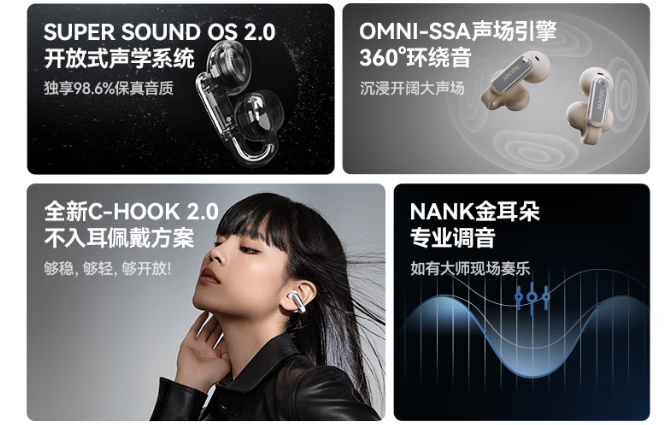 2、南卡实验室主导研发的SUPER SOUND OS2.0声学系统,足以使得整体音感提升90%,通过Q-SONIC量子音频还原引擎、FC超感知动态补偿系统灯创新黑科技,精准呈现音乐的每一个细节,毫不夸张的说足以达到开放式耳机的音质领域的巅峰位置。