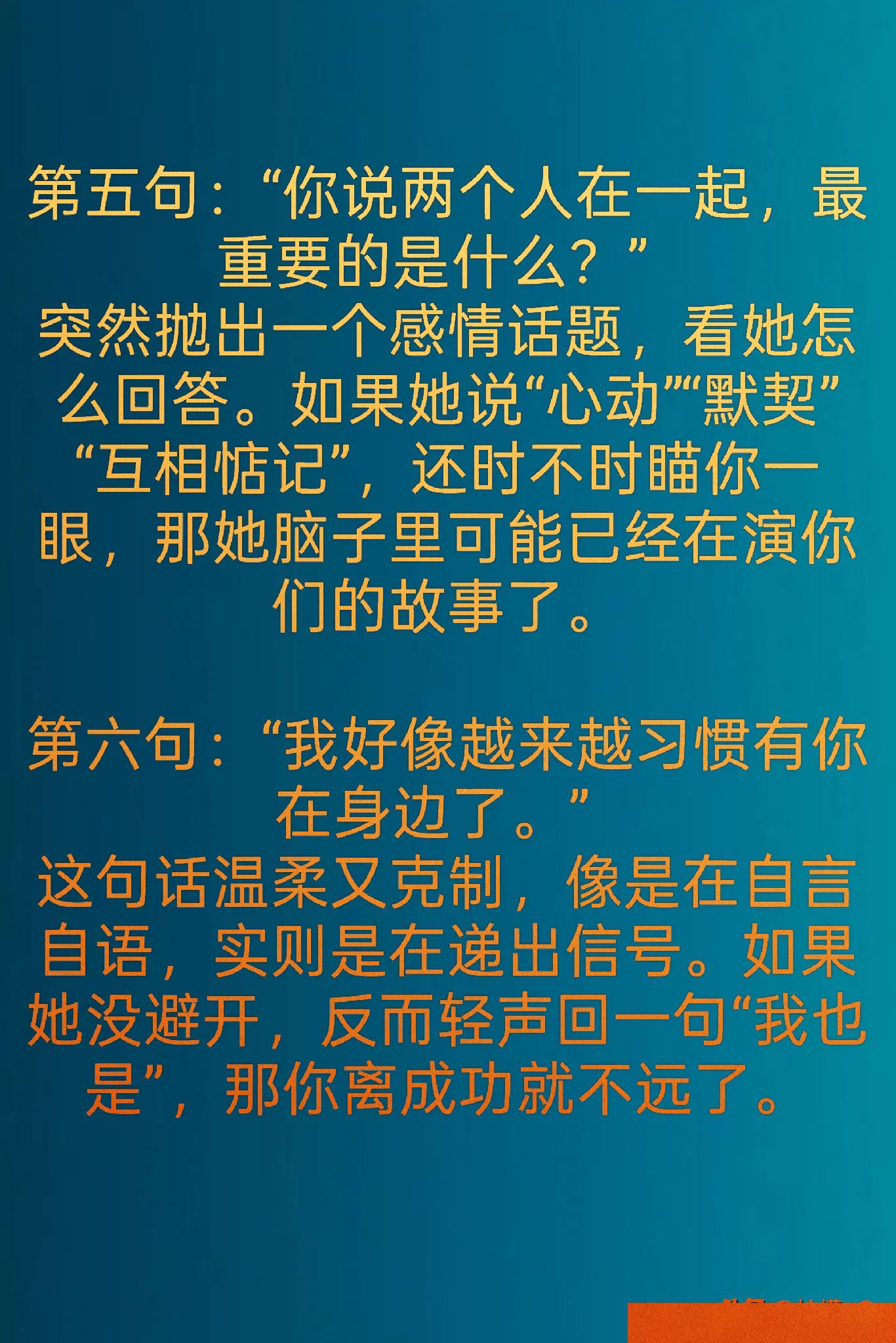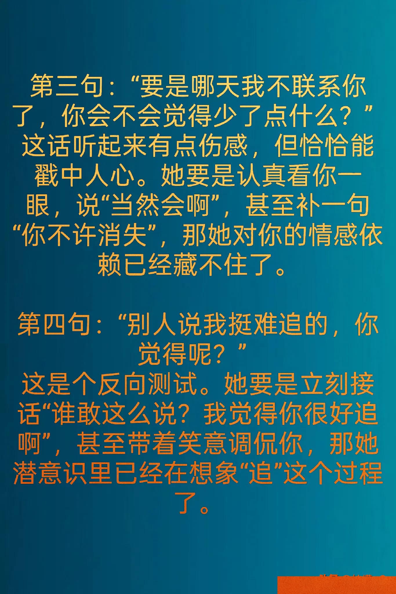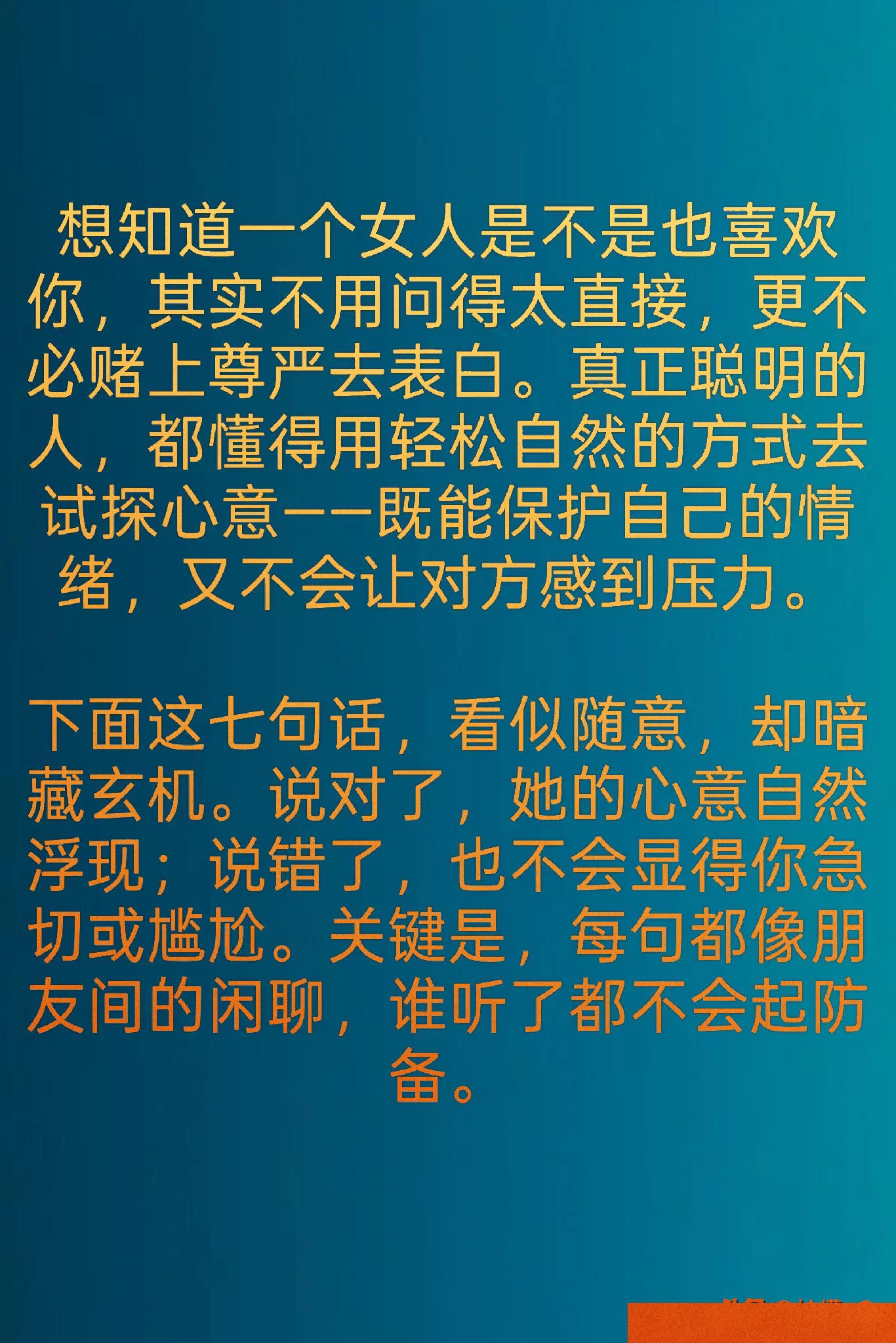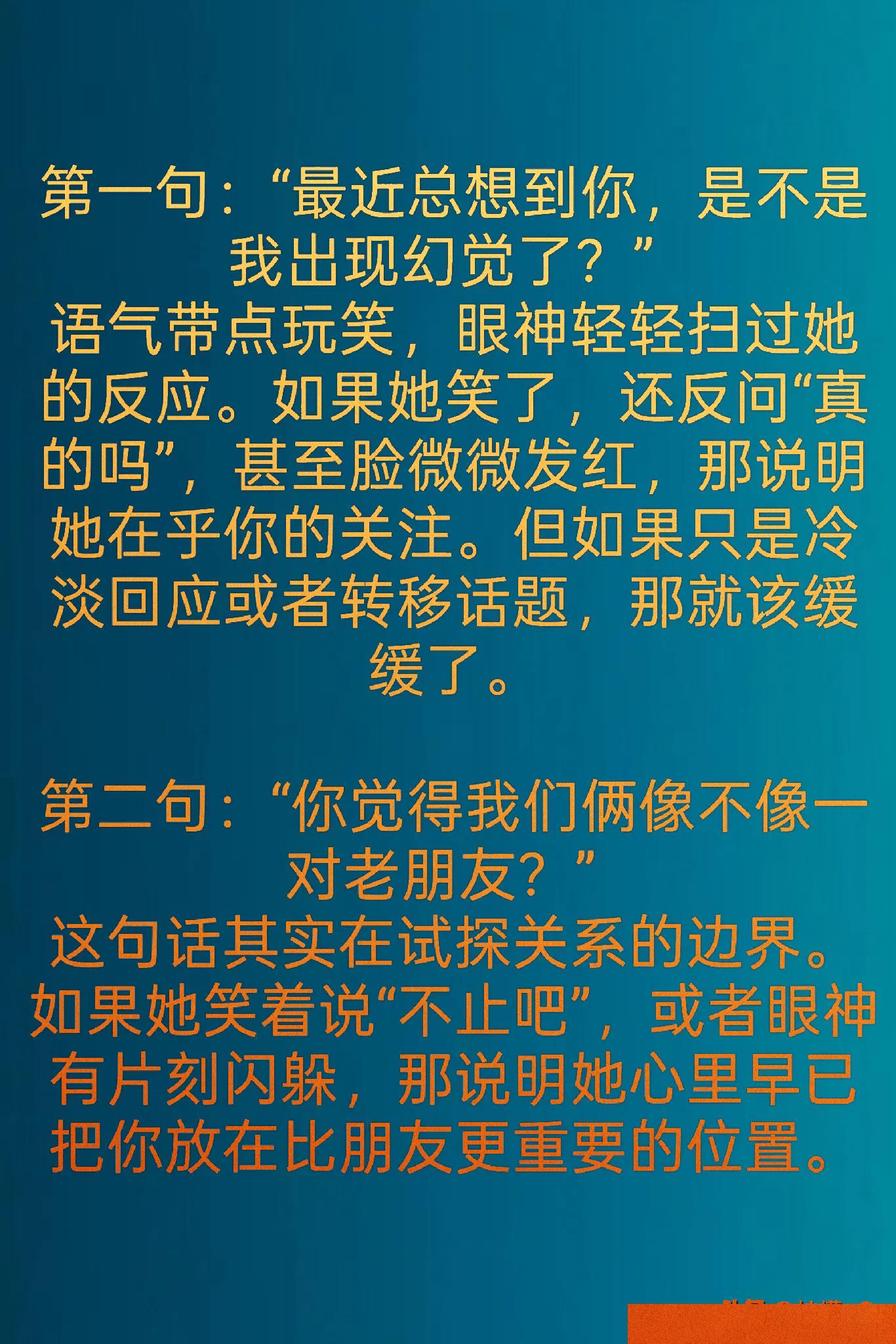 感情里最让人辗转反侧的,不是被拒绝的瞬间,而是无数个深夜里自我拉扯的“我本可以”。你害怕一腔孤勇换来尴尬收场,更害怕两个明明合拍的灵魂,因为沉默而遗憾错过。所以,别再用“敢不敢”去豪赌真心。真正高级的试探,是给彼此一个舒服的台阶,一次心照不宣的确认。这七句话,不是单刀直入的“我喜欢你”,而是递出一颗糖,温柔地问“我们好像很合拍,你觉得呢?”它像一把钥匙,轻轻叩响心门,不强求也不打扰。如果门开了,那便是双向奔赴的序曲;如果门没开,你也能体面退场,保护好自己。去吧,用最自然的方式,给你的心动一个答案。