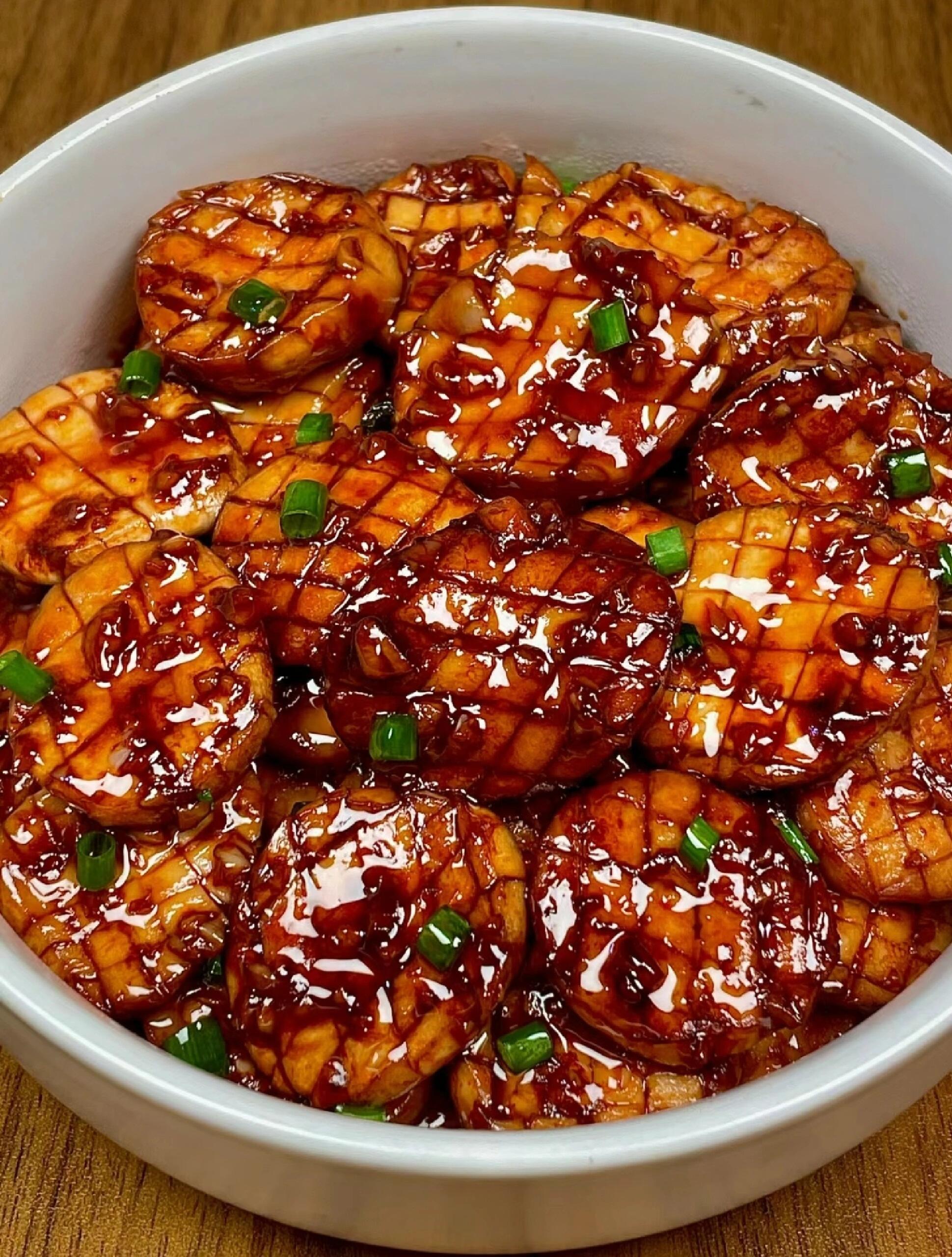 最后撒上切好的葱花,翠绿的葱花点缀在酱红色的杏鲍菇上,颜值瞬间提升了好几个档次!把杏鲍菇盛出来装盘,酱汁千万别浪费,全部浇在上面,那浓稠的酱汁拌饭简直是一绝。