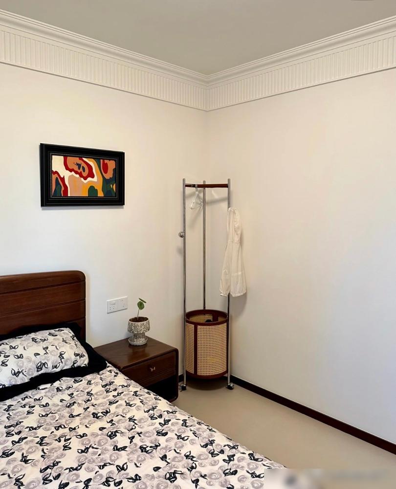 卧室设计看着真心舒服!床尾不堆斗柜梳妆台,走道宽敞得能打太极。全屋定制现在动不动大几万,他们家就买成品家具,床头挂幅画加点绿植,烟火气马上就来了。