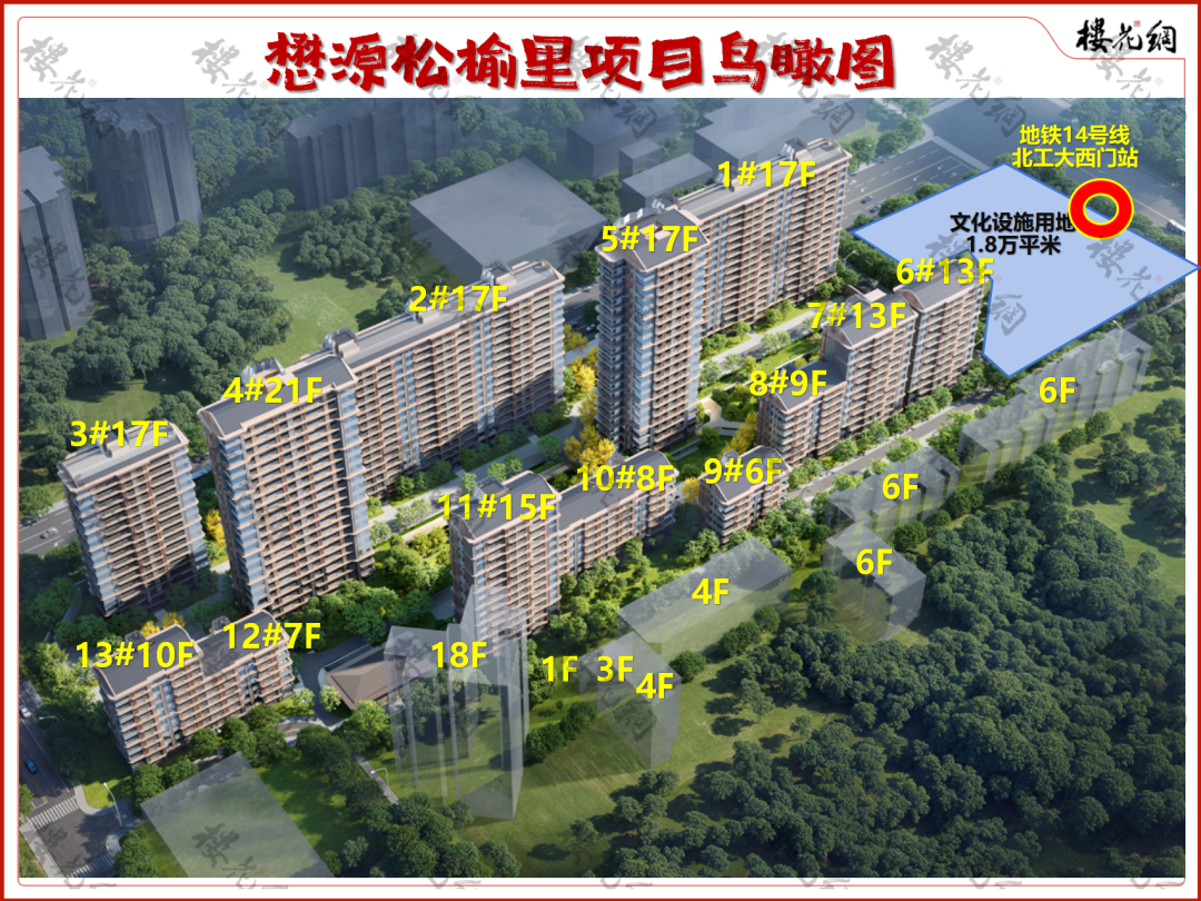 松榆里项目在楼栋排布上,采用了行列式加梅花桩组合,一共规划13栋楼,从6F、7F、8F、9F、10F、13F、15F、17F到21F,相互错落。