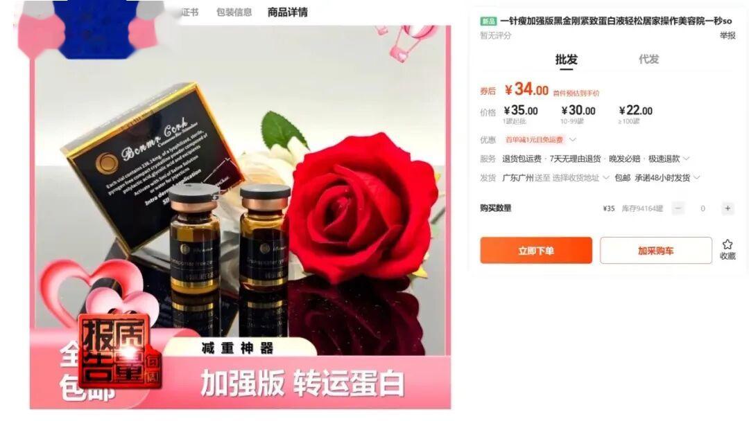 “黑金转运蛋白”,这科技感十足的名字吸引来大量关注。大学生小李近日就购买了名为“转运蛋白”的减肥针。收到产品后她发现,产品包装上除了一枚所谓的防伪标志,竟无任何中文标识。她向商家询问,产品的相关资质。