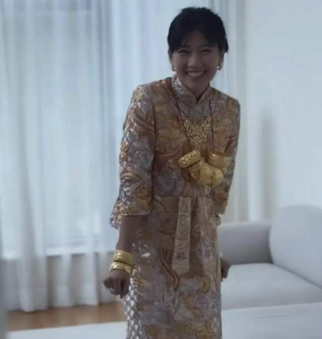 在酒店举行仪式时,郑瑶穿着定制的中式礼服,搭配富丽堂皇的金饰,尽显传统文化中“金银满身”的寓意,象征吉祥和富贵。最抢眼的要数她的龙凤镯,除了双手戴满之外,胸前的6个大金镯分量十足,华丽程度可见一斑。