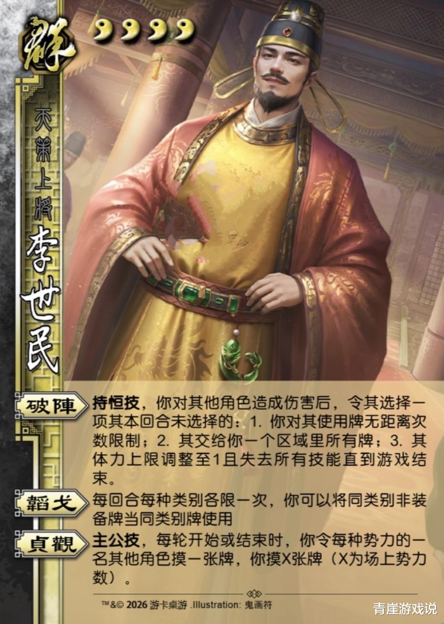 李世民【破阵】上限高但难触发,必须通过【韬戈】来打多次伤害,进而触发出【破阵】的全部效果。而【贞观】虽说是添头技,但摸牌数量同样决定了【韬戈】的触发次数,再而影响到【破阵】的触发频率。