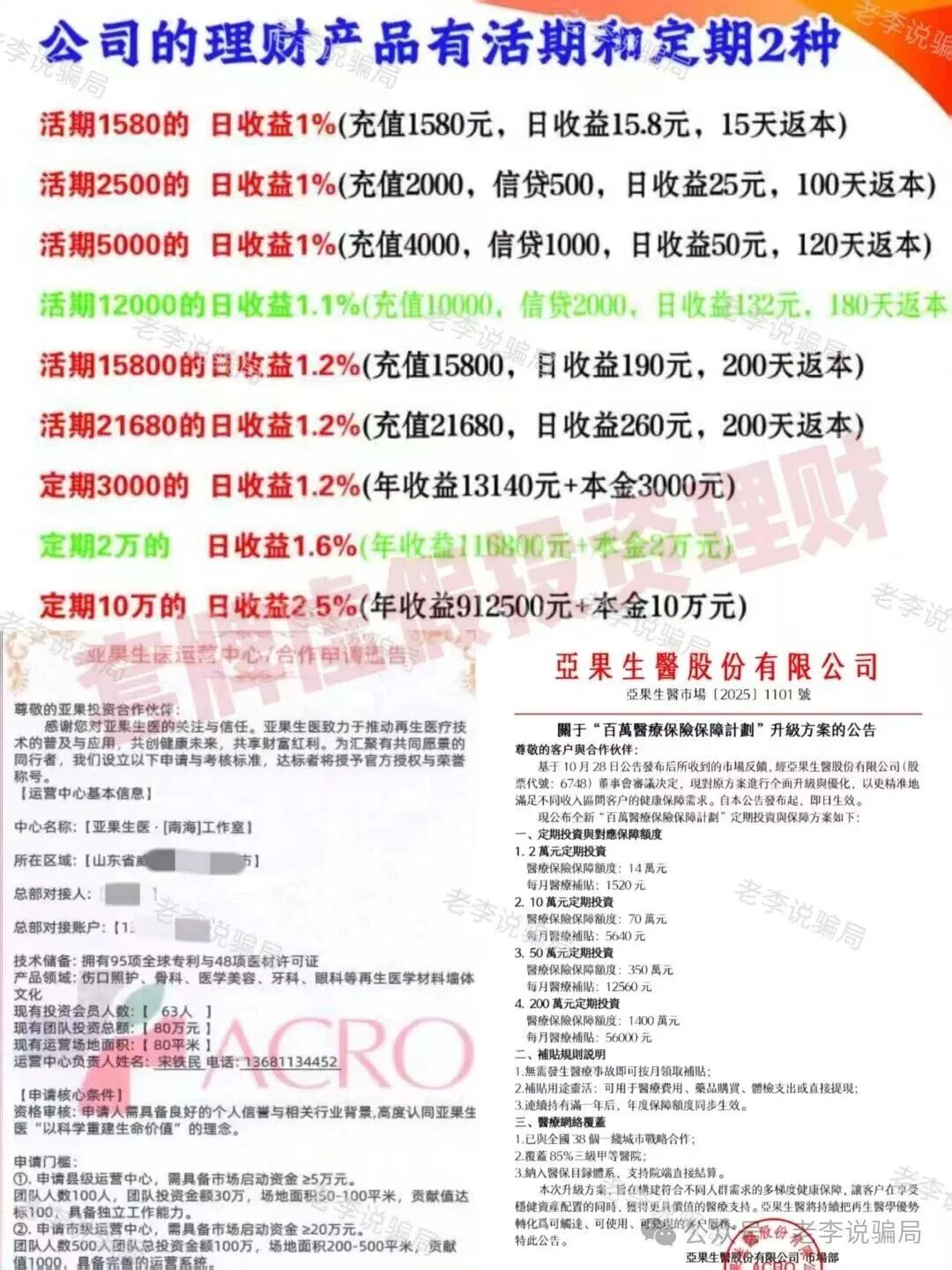 ●2. 套牌的“亚某生医”APP:冒充香港公司,虚构高息理财产品,日收益超1%,推广模式存在多级分佣,与真实医疗产业盈利情况严重不符。