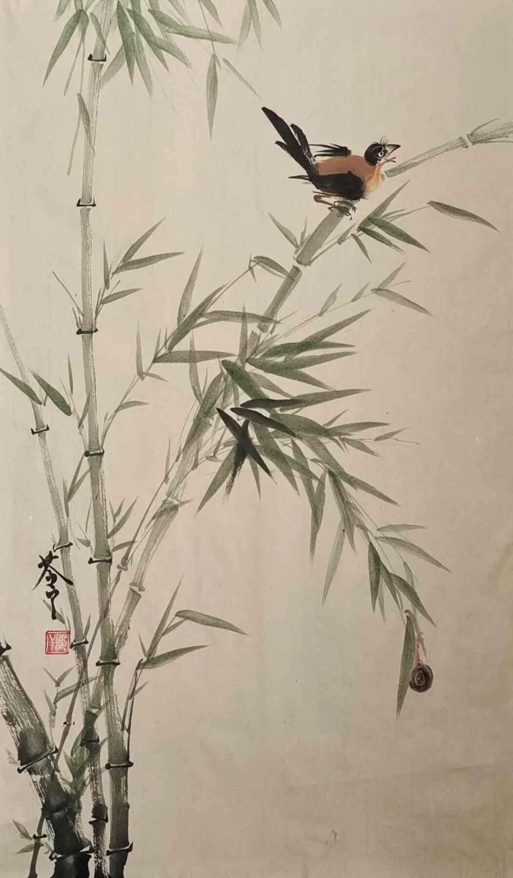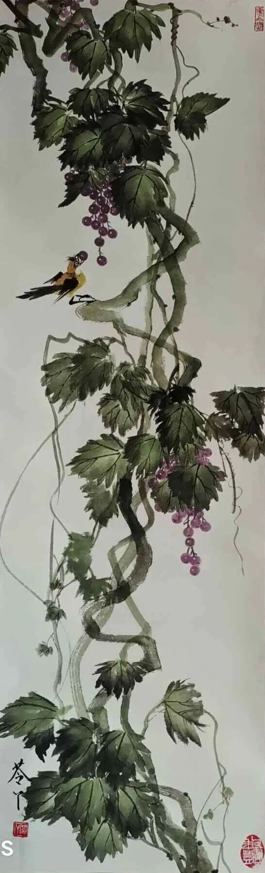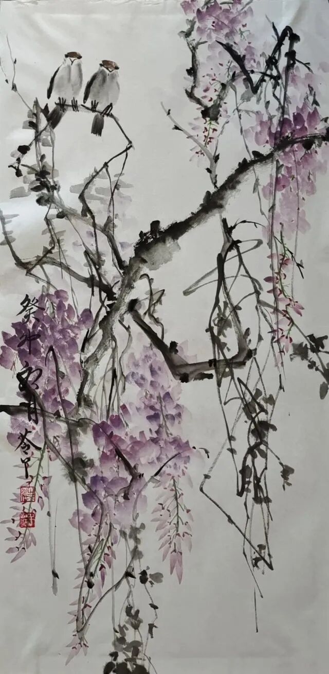 汪千龄的绘画最动人处,在于其构建的“可居可游”的精神空间。她将宋人花鸟的“折枝构图”与文人画的“留白哲学”相结合,通过疏密有致的枝叶安排,形成“密不透风,疏可走马”的视觉节奏。这种构图智慧,既源于对郭熙“三远法”的继承,又融入了现代平面构成理念。