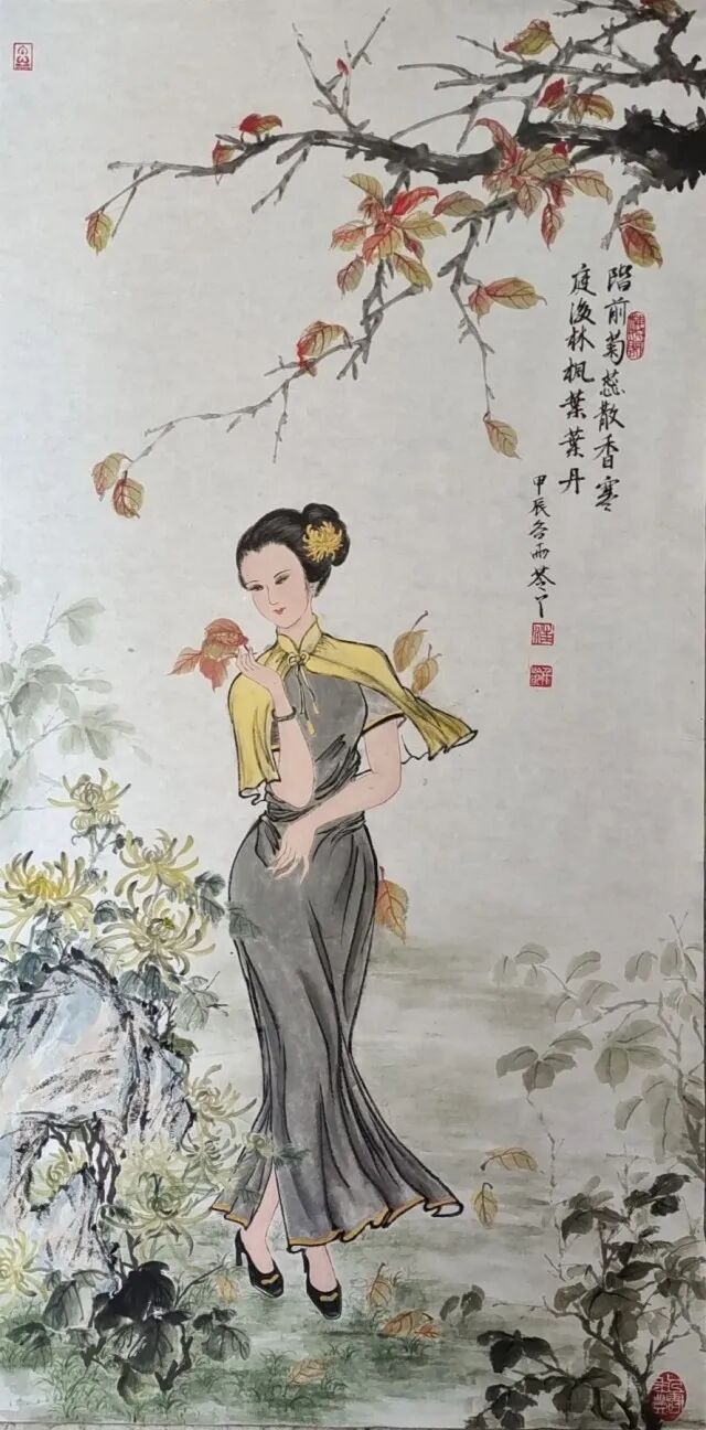 作为中国东方文化研究会高级研究员,汪千龄的绘画始终贯穿着文化自觉,形成“工笔写实、水墨写意”的独特风格。其作品中的符号系统也值得玩味。以梅花象征坚韧,以仕女代表优雅,通过“花与人”的意象并置,构建出“天人合一”的哲学境界。这种符号运用,既延续了传统花鸟画的寓意传统,又通过现代构图手法,实现了古典意象的当代表达。