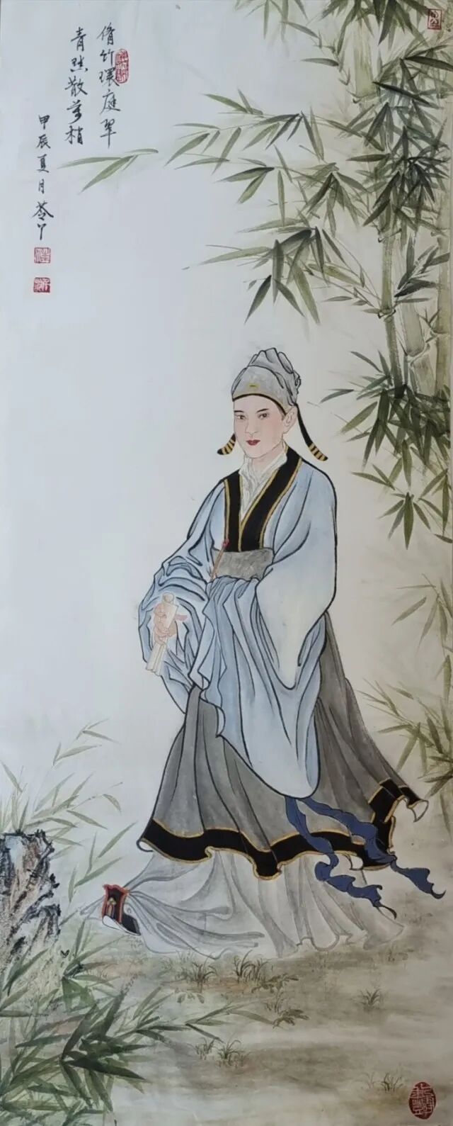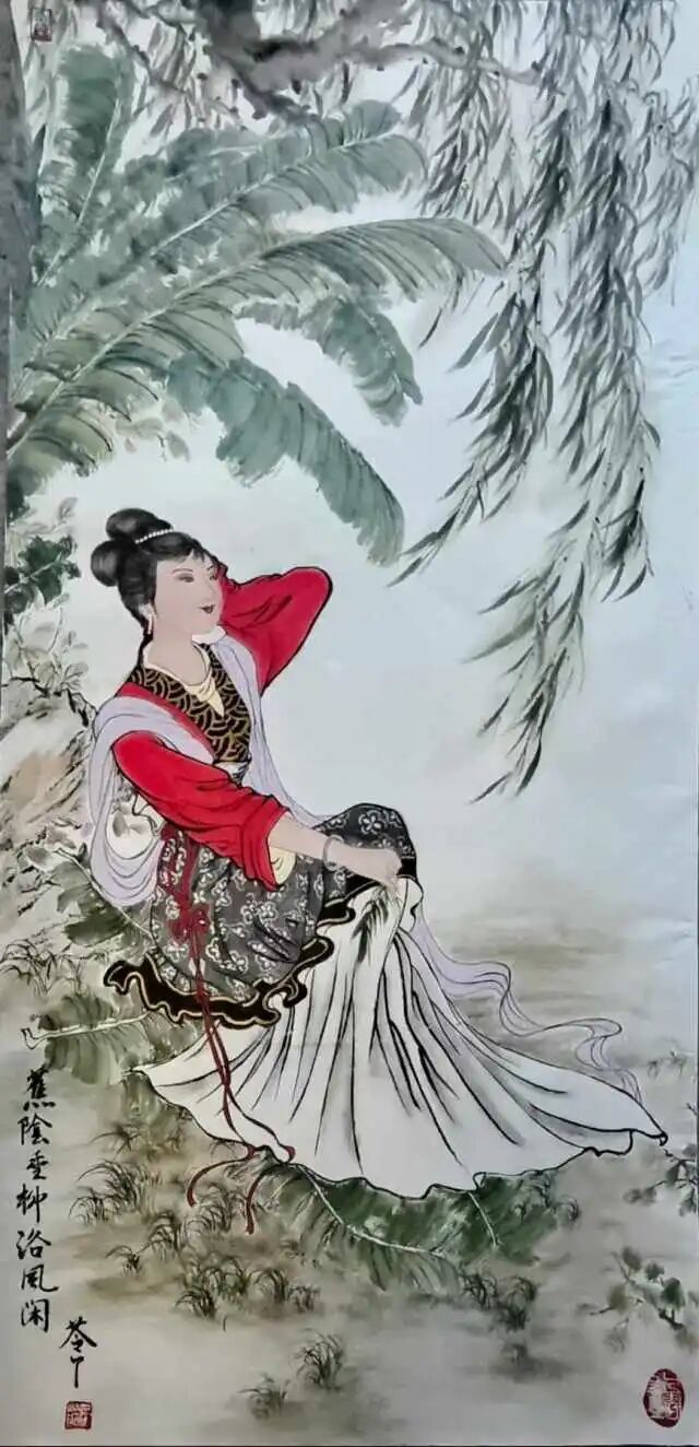 其工笔仕女画突破传统程式,以“细而不腻、柔而不弱”的线条勾勒人物轮廓,通过多层罩染实现肌肤的温润质感。在生宣上完成发丝根根分明的细节,这种“以工笔写意”的技法革新,打破了宣纸对工笔画的材质限制。而水墨部分则采用“破墨法”,通过浓淡墨色的自然渗化,营造出“云气氤氲”的朦胧意境。