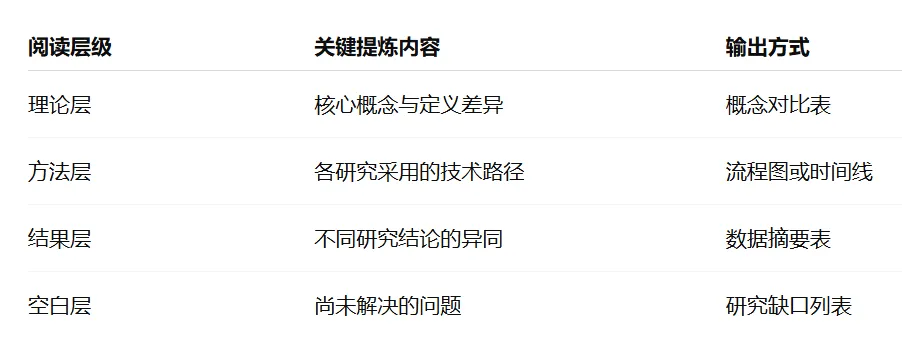 很多人读完文献便直接着手撰写,实际上这般效率并不高,阅读之时,目标并非是“看完”而是“提炼结构”,可用下述表格来梳理思路: