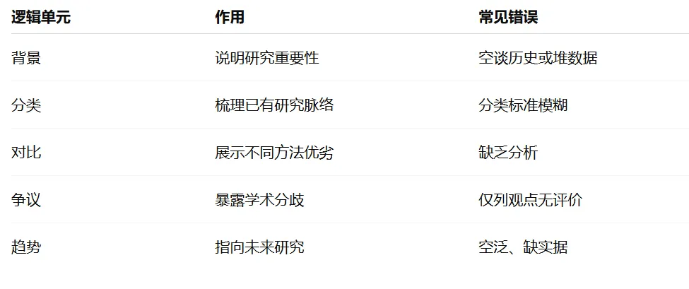 综述写作实际上就是构建一种叙述逻辑,并非将资料简单地搬过来,较为成熟的结构通常是这般模样的: