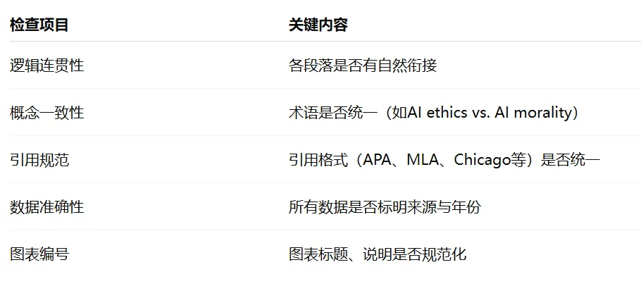 最后阶段,乃完善“形式方面”,文献综述的修改,不单单是语言润色,更是逻辑校对,建议反复核查如下几点: