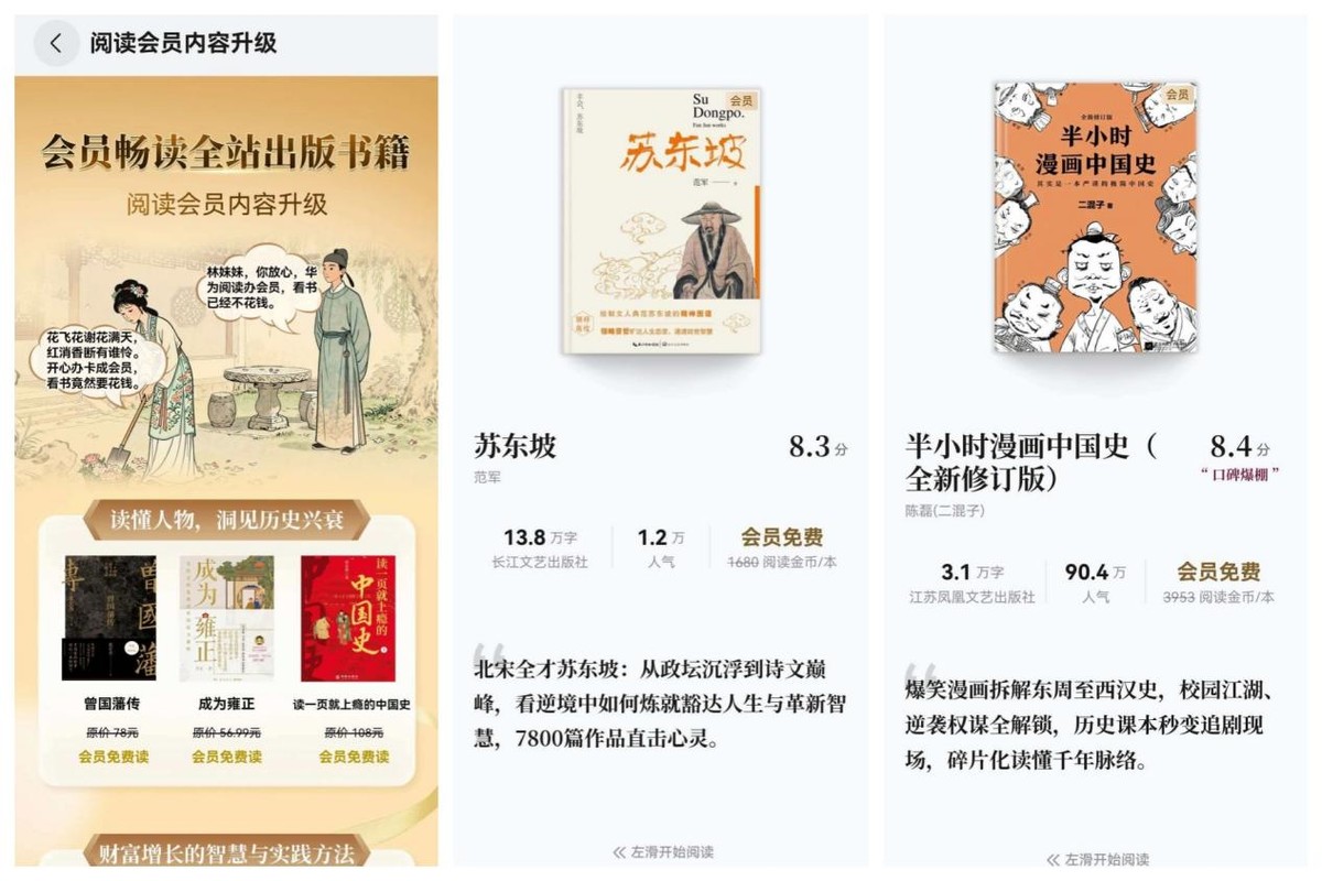 这次体验让我对华为阅读好感倍增,而且我发现,现在的华为阅读VIP会员权益真是“大升级”了,很多新书或热门出版书,比如我收藏夹里躺了很久的《苏东坡传》和想给孩子囤的《半小时漫画中国史》,全都加入了VIP“免费全家桶”,像磨铁、上海译文、理想国这些大牌出版社的海量好书,会员期间都能免费畅读,再也不用“二次付费”了,这价值感瞬间拉满。