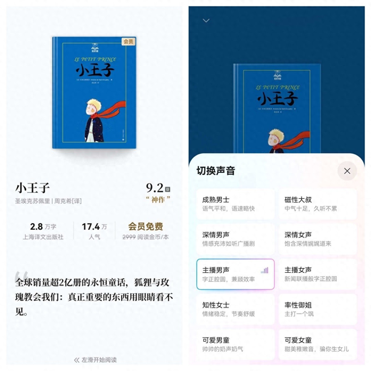 但打工人996搬砖一天,有时真是筋疲力尽。就比如上周,一个项目忙到焦头烂额,回家时嗓子都哑了,实在没力气开口。可看着女儿一脸期待的小眼神,又实在不忍心让她失望。我灵机一动,打开了华为阅读App的“听书”功能,点开《小王子》,在精品音色里选了“主播男声”,打算“偷个懒”。