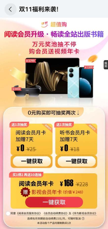正巧赶上双十一,华为阅读的优惠也“杀疯了”,原价228元的阅读年卡,现在只要168元。最狠的是,买了阅读年卡,竟然还送一整年的华为影视会员(价值248元)!等于我花168块,同时搞定了自己追剧和给娃读书两个需求,光赠品都比我付的钱还贵,这羊毛必须薅!