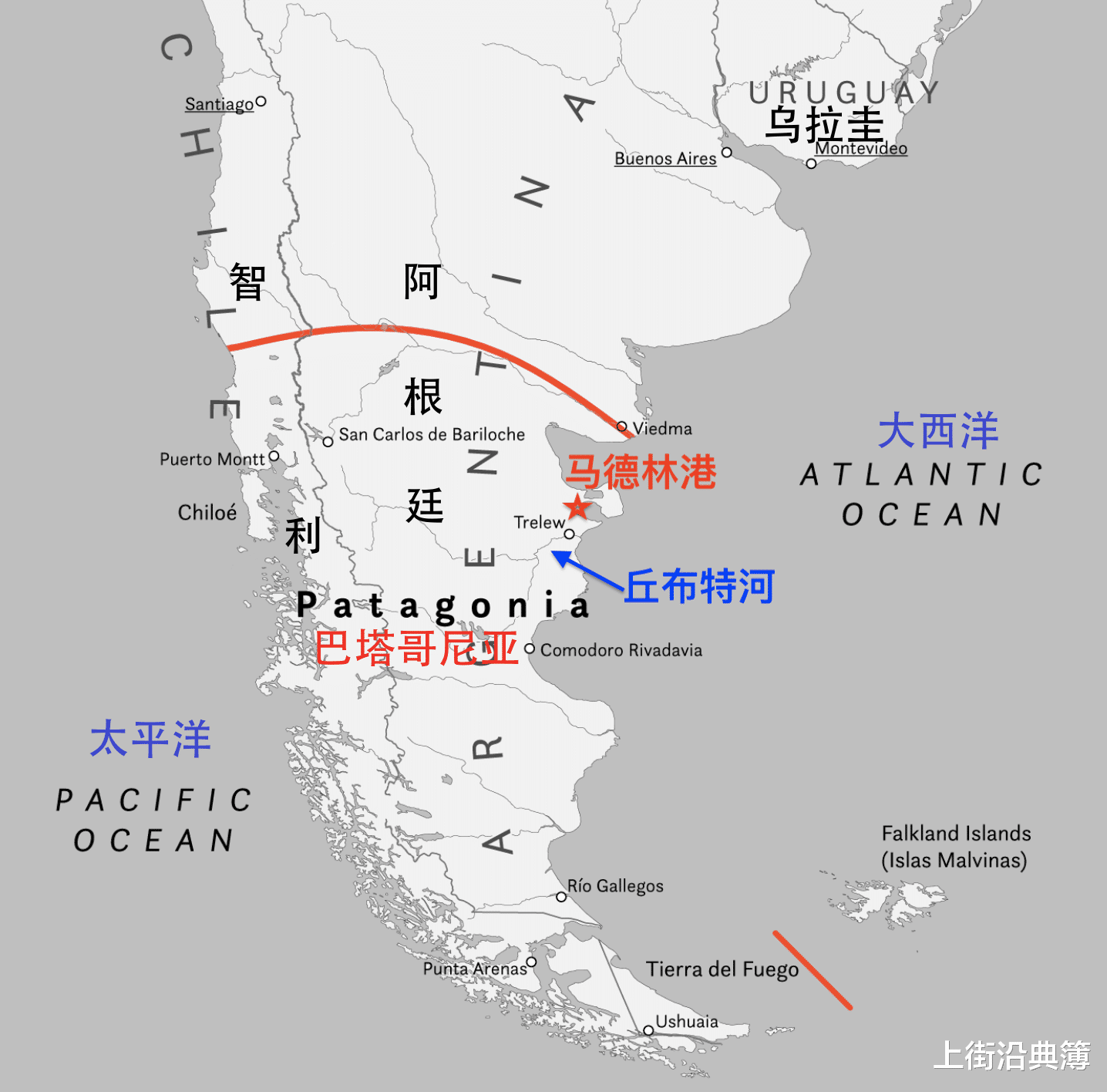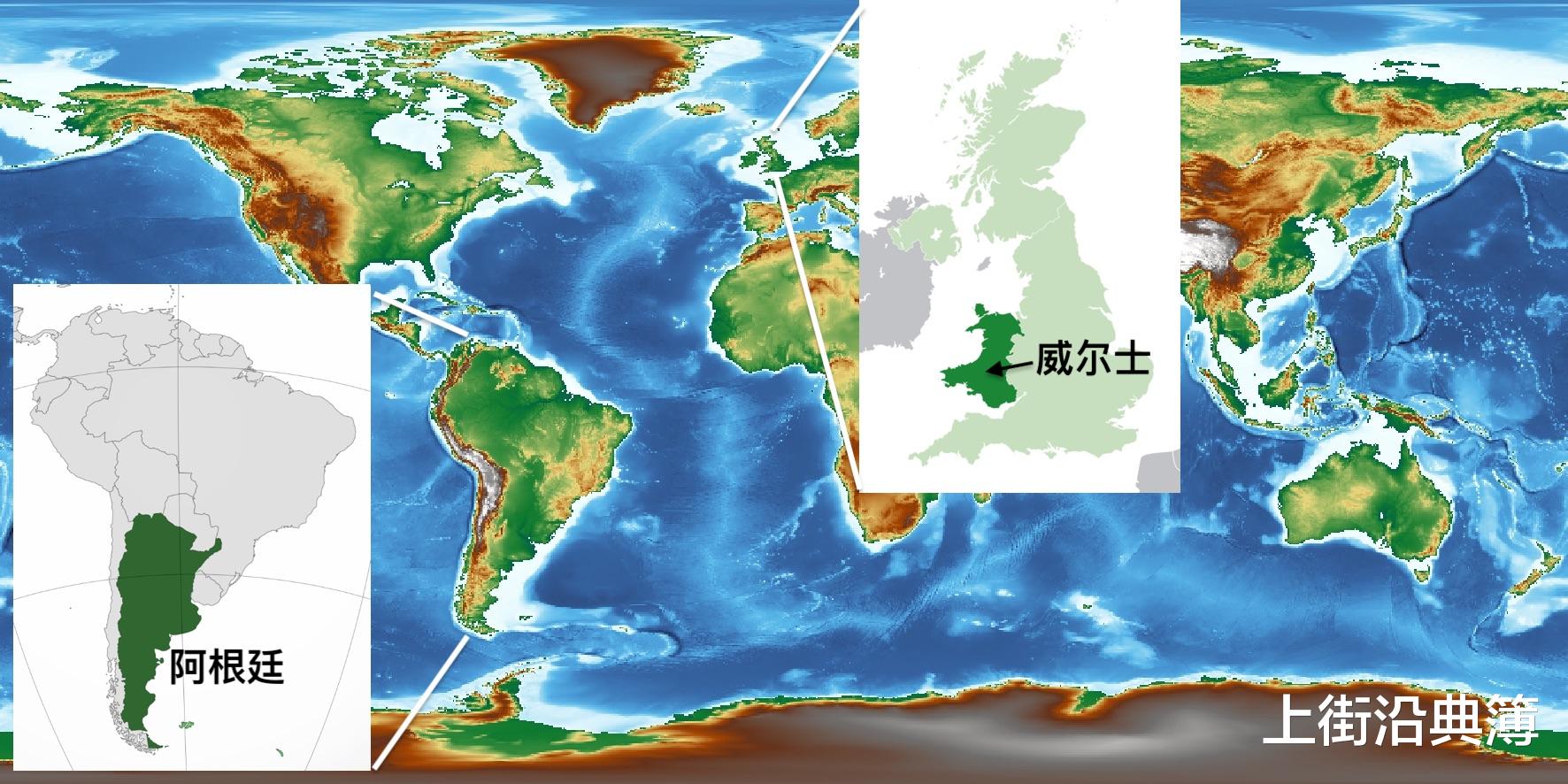 威尔士在不列颠岛的西南角,三面挨着海,和爱尔兰隔着海相望。而巴塔哥尼亚高原在地球的另一边,得跨越大西洋,越过赤道,到达南美洲阿根廷的南端。