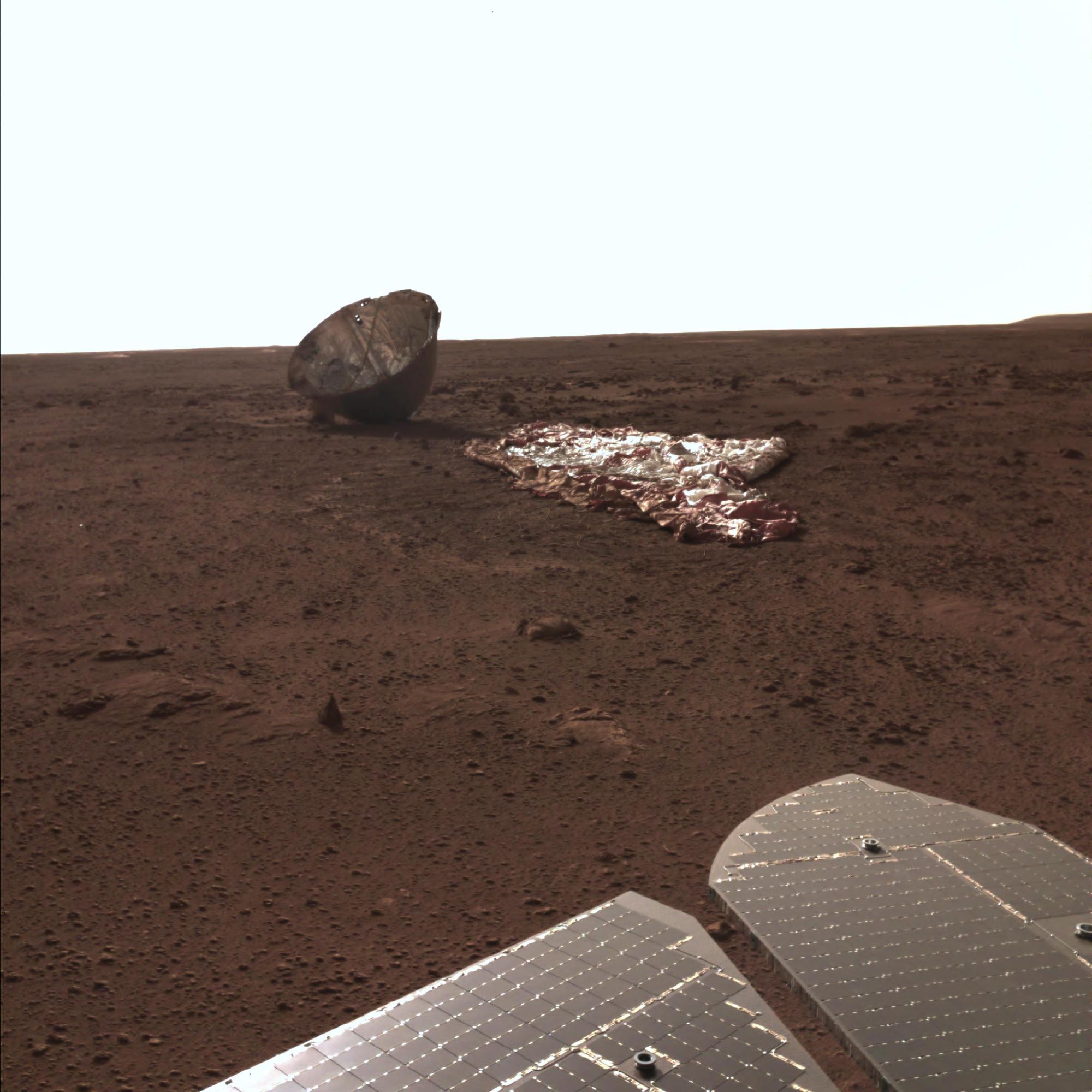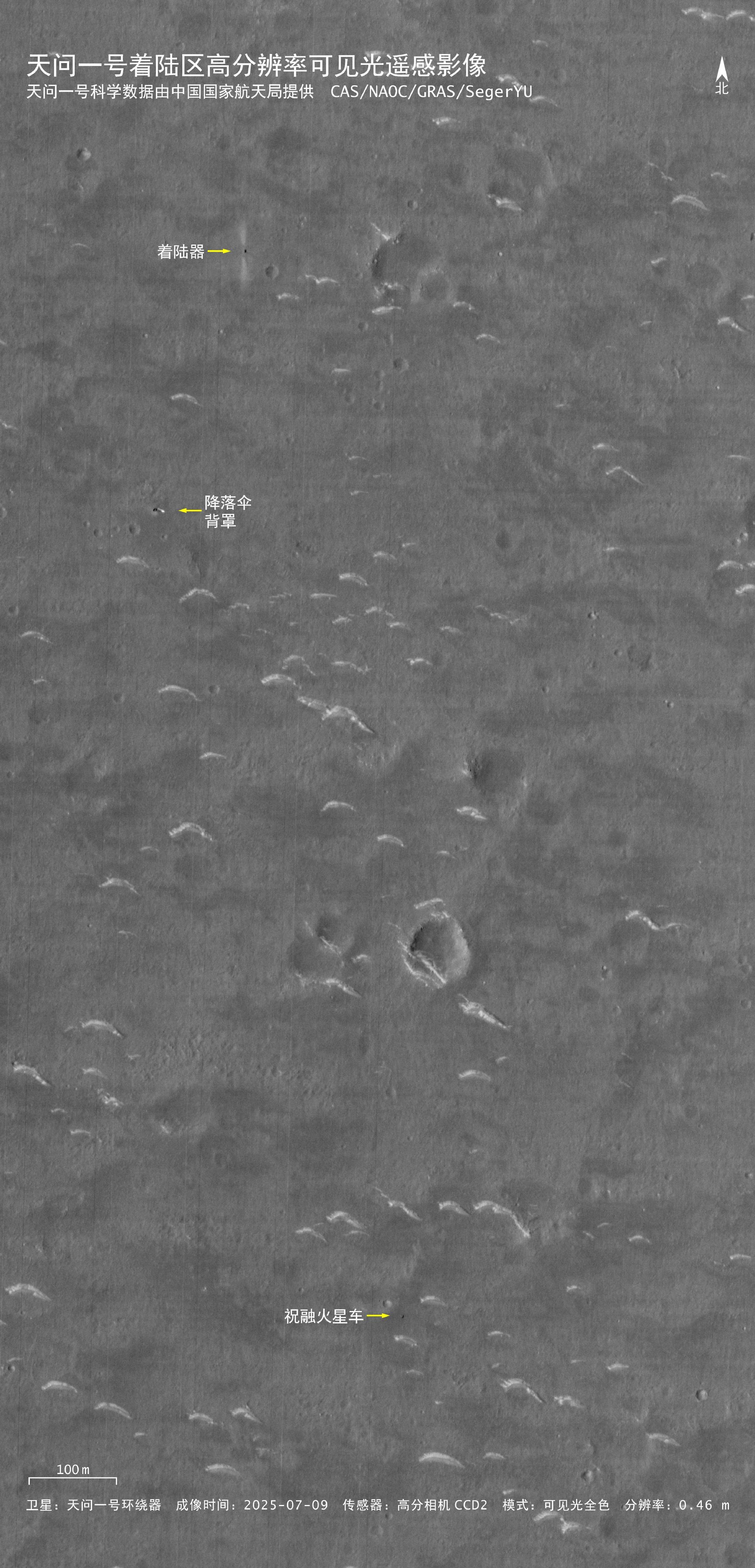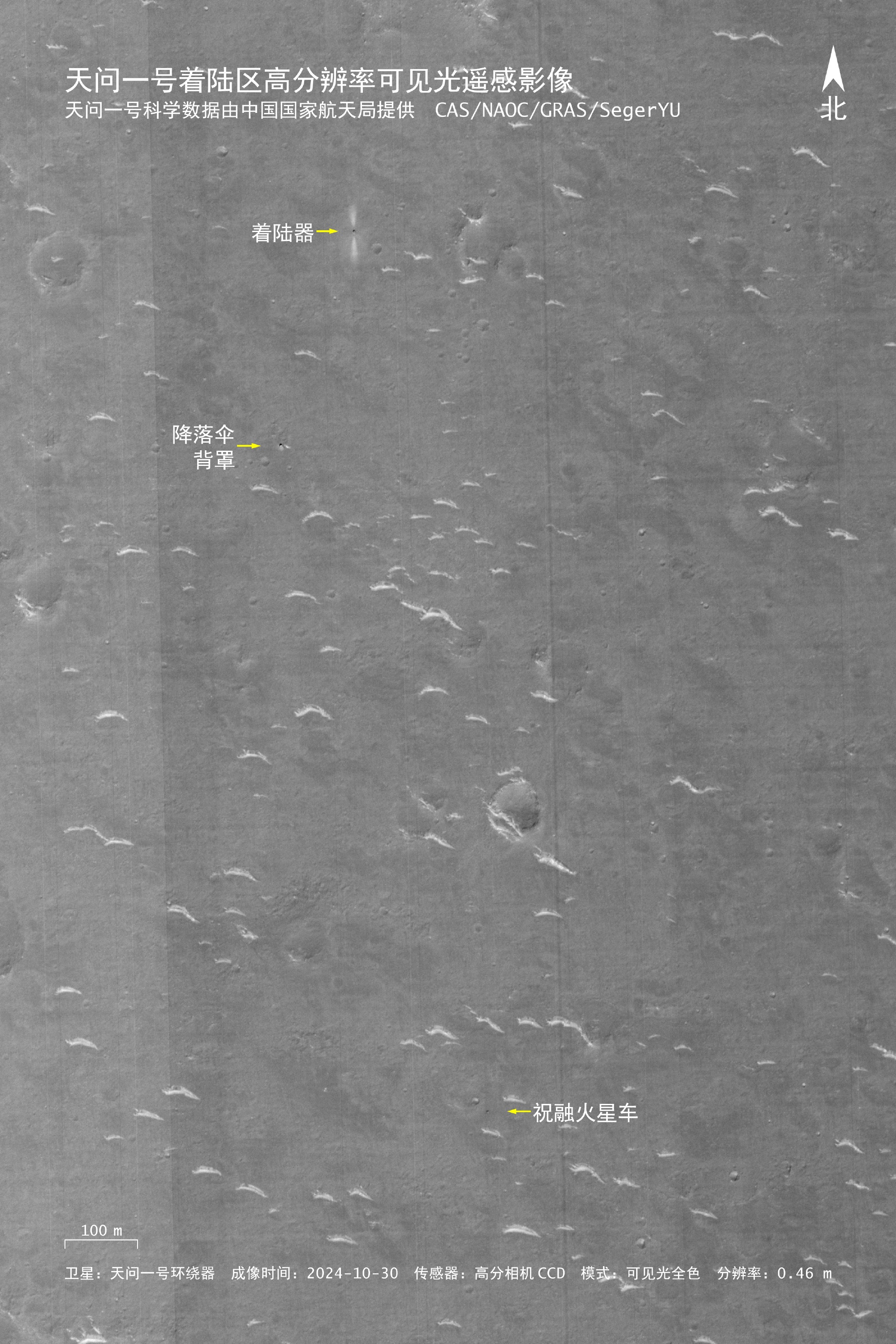 从分辨率可达0.46米的新照片中,可以看到着陆器、降落伞和背罩,同时还有让大家最为牵挂的祝融号火星车。祝融号曾在火星表面上留下的车轮印,如今已经看不出来了。