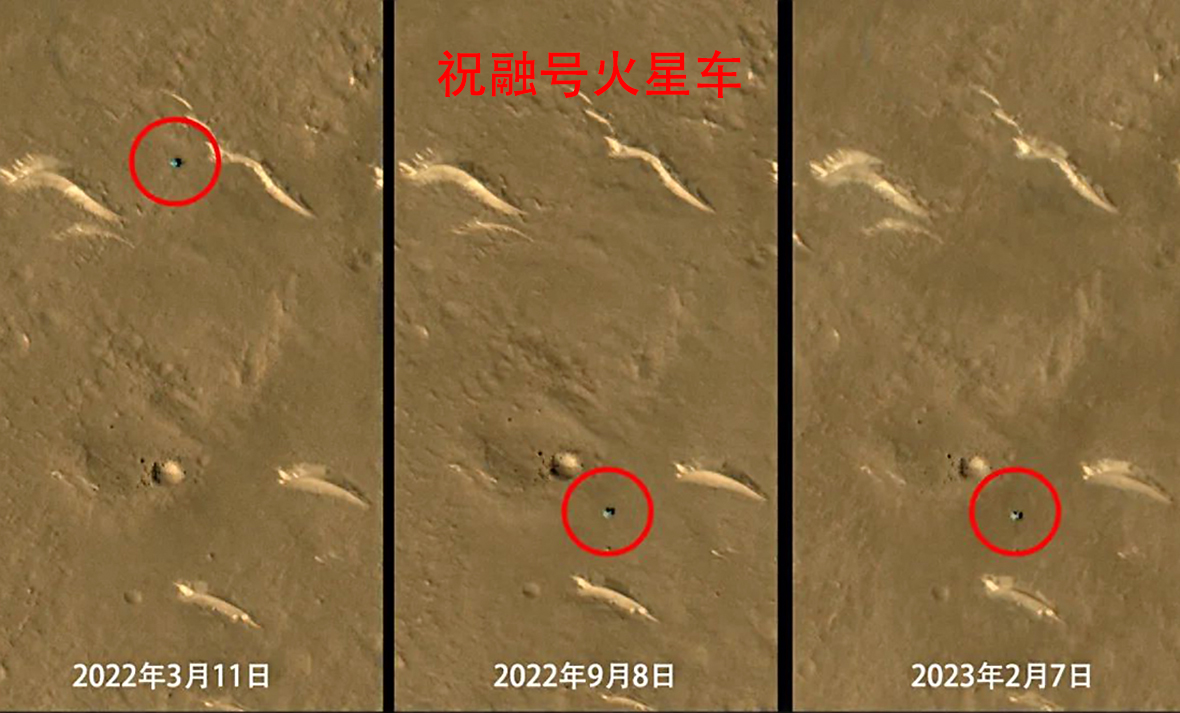 事实上,在上一次,也就是2024年10月,天问一号对祝融号进行拍摄时,就看到祝融号的车轮印基本上已经基本消失了。两次照片对比可以发现,祝融号仍然停留在原地,没有再次苏醒过来。如果从更早的2022年9月算起,祝融号已经停留在原地三年半的时间。