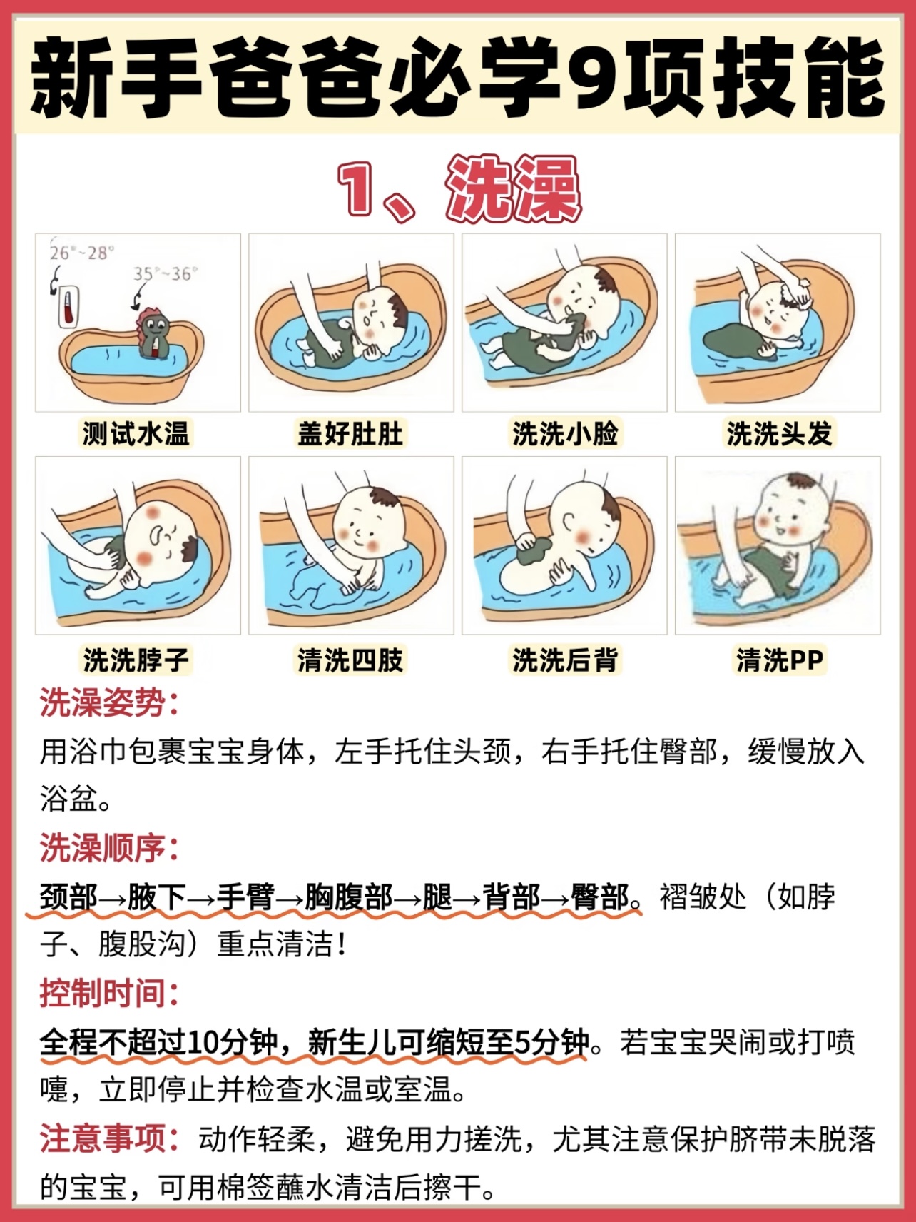 洗澡:洗澡前要准备好所有用品:浴盆、毛巾、洗发水、沐浴露、换洗衣物等。水温要适中,大概37到38度,用手腕试试,不凉不热正好。洗澡时先洗头,再洗身体,注意别让水进到宝宝耳朵里。洗完后用毛巾轻轻擦干,涂上润肤露,宝宝立马变得香喷喷。