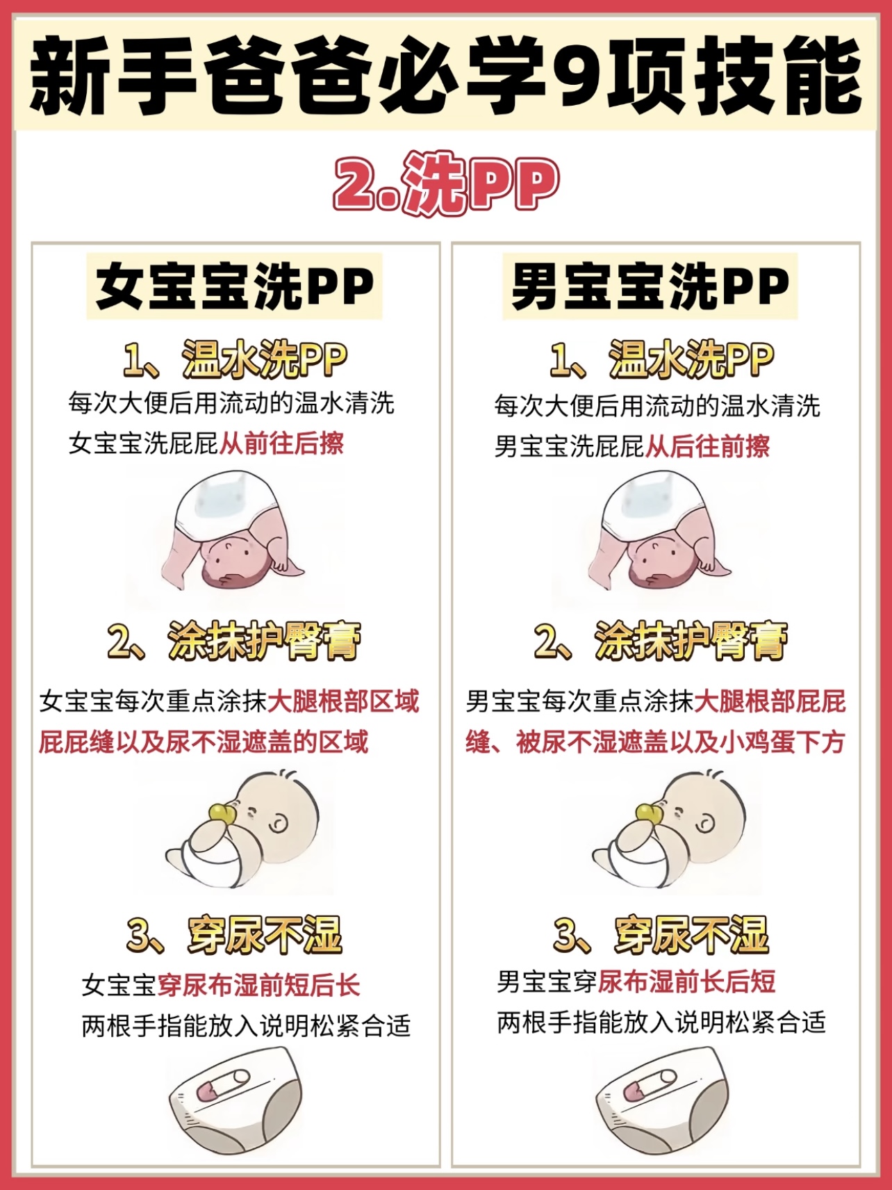 洗pp:每次大便后用流动的温水清洗,女宝宝洗屁屁从前往后擦,男宝宝洗屁屁从后往前擦,洗好后涂抹护臀膏,穿好尿不湿。