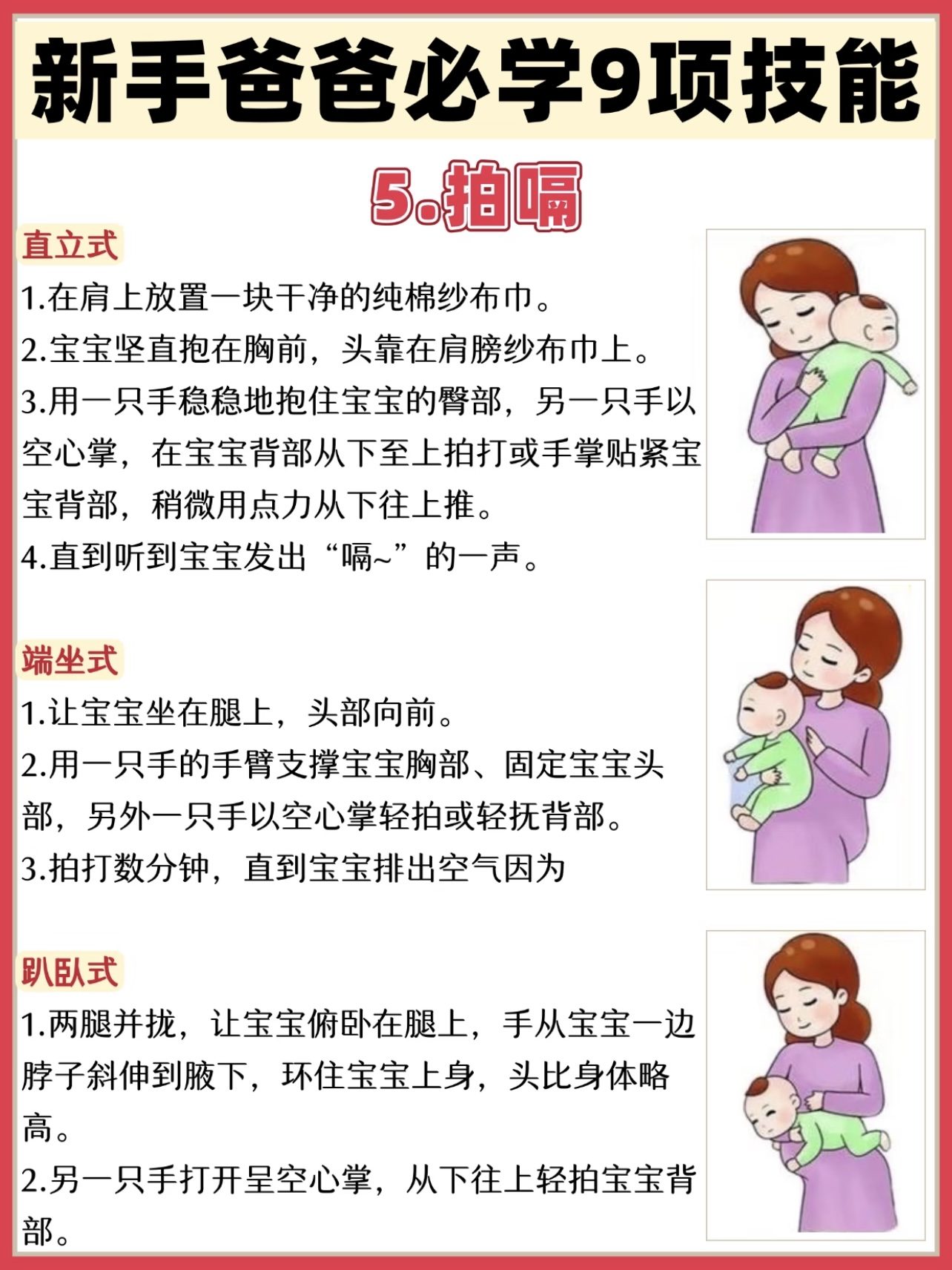 拍嗝:宝宝吃完奶容易打嗝,这时候需要爸爸来“救场”。把宝宝竖抱起来,让他的头靠在你的肩膀上,用空心掌轻轻拍他的背,从下往上拍,直到打出嗝为止。拍嗝不仅能缓解宝宝的不适,还能增进亲子感情呢。