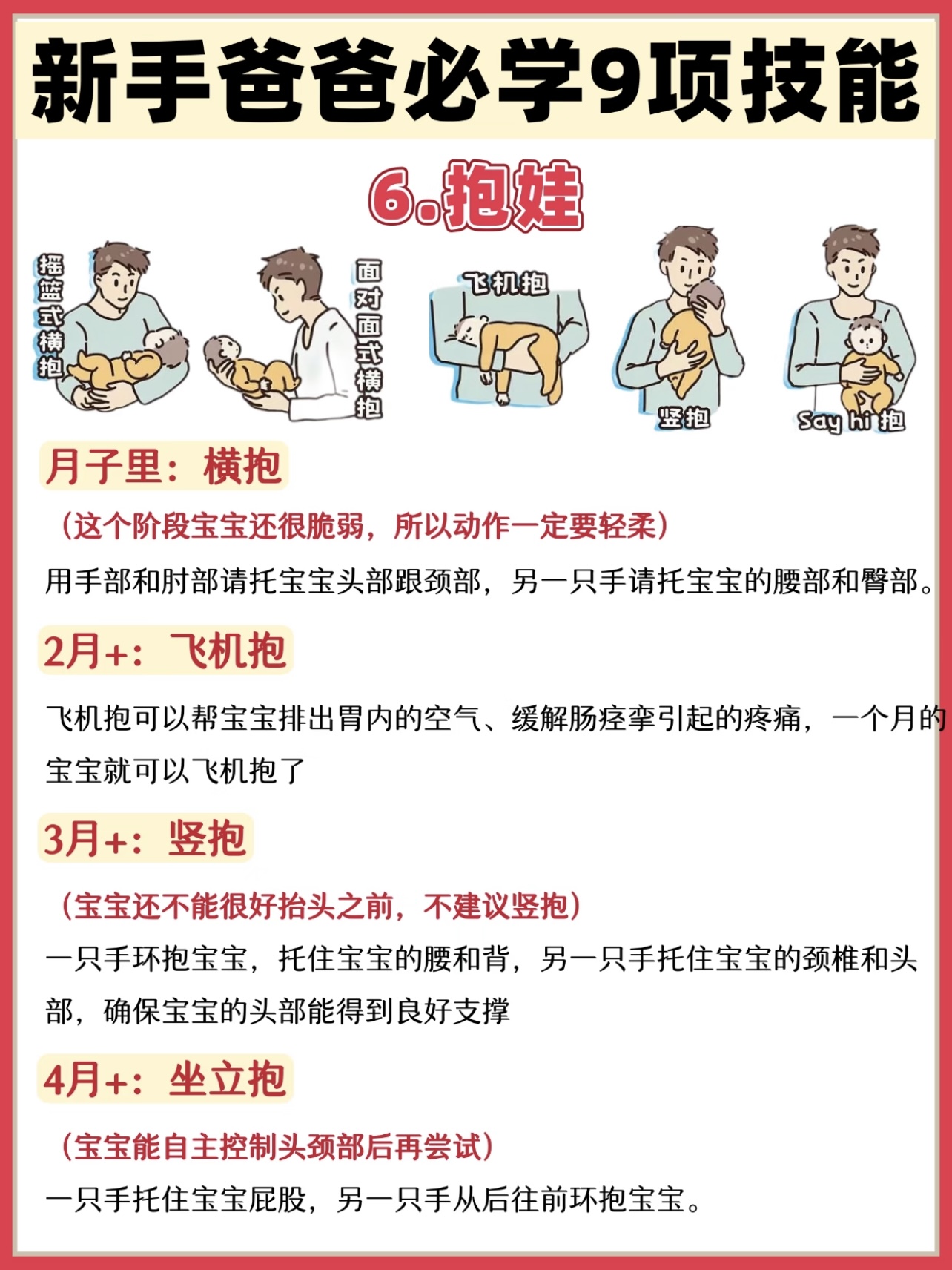 抱娃:新手爸爸常犯的错是抱得太紧或太松,宝宝不舒服,自己也累。正确姿势是:一只手托住宝宝的头和脖子,另一只手托住小屁股,让宝宝靠在你的肩膀或胸前,像抱着个小宝贝似的。记住,宝宝的头要稍微高一点,防止吐奶呛到。