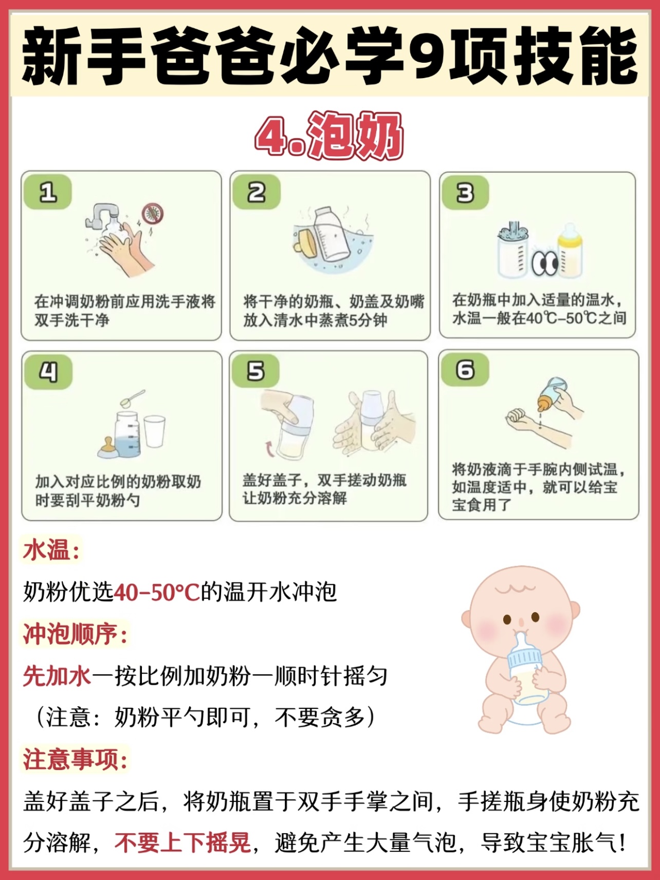 冲奶粉:别以为冲奶粉就是倒点水加点粉那么简单,水温、比例都有讲究。一般水温在40到50度之间,奶粉和水的比例按说明书来,别太浓也别太稀。冲好后摇匀,试试温度,不烫嘴再给宝宝喝。记住,冲奶粉是爸爸的“专属任务”,妈妈们可等着看你表现呢!