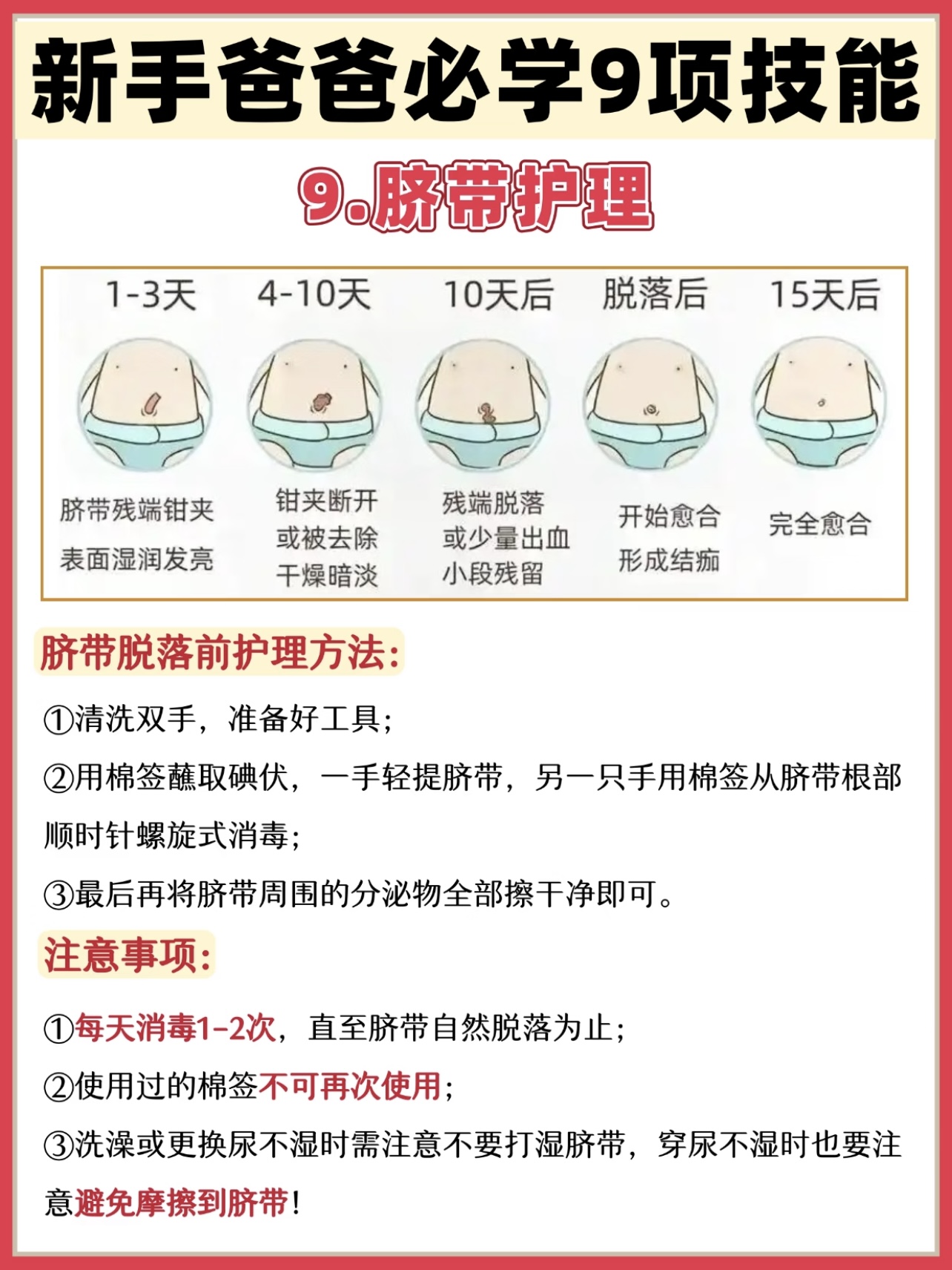 脐带护理:每日用75%酒精棉棒从根部螺旋消毒,保持干燥直至自然脱落,洗澡时可以贴防水贴防护。